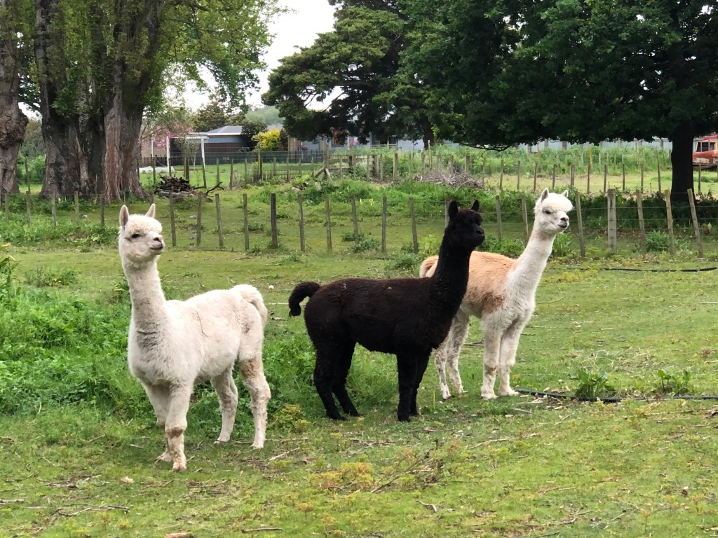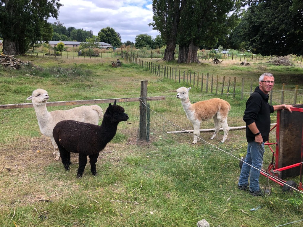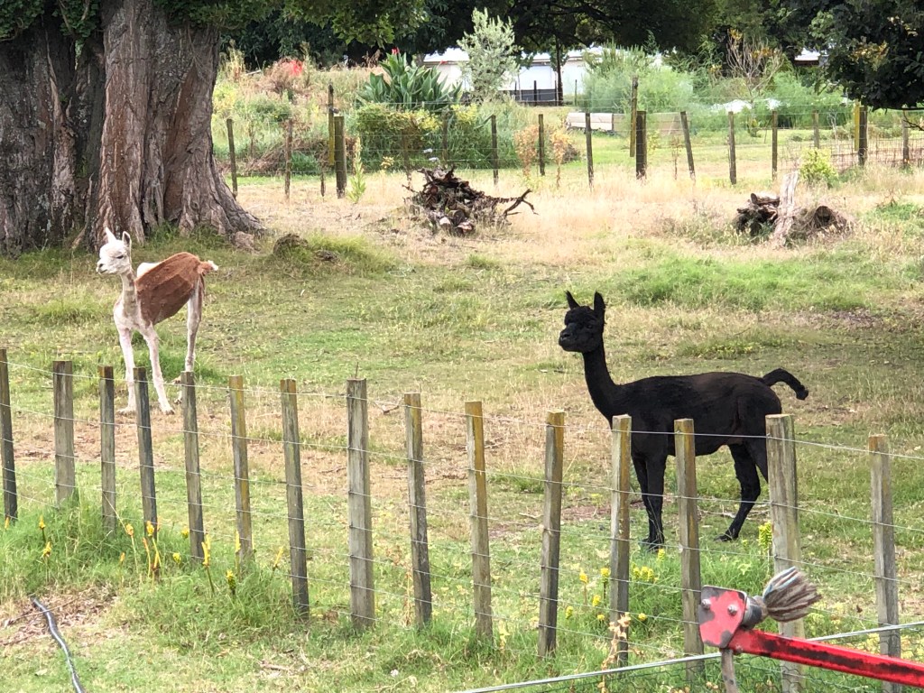 Womit Harvey auch noch ein Problem hat, sind die Alpacas – die bellt er an wie verrückt, hauptsächlich, wenn wir sie füttern, da wird er total eifersüchtig und tickt völlig aus, während die Alpacas ihn nur erstaunt anschauen: