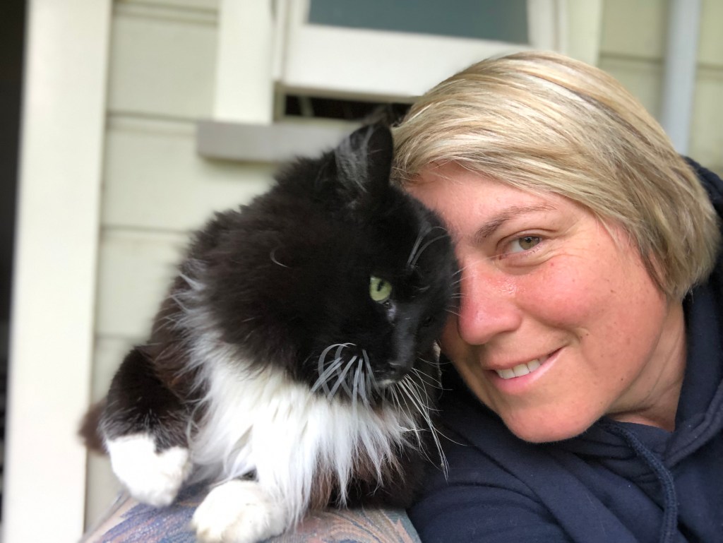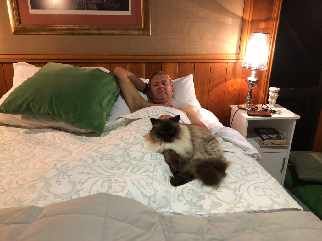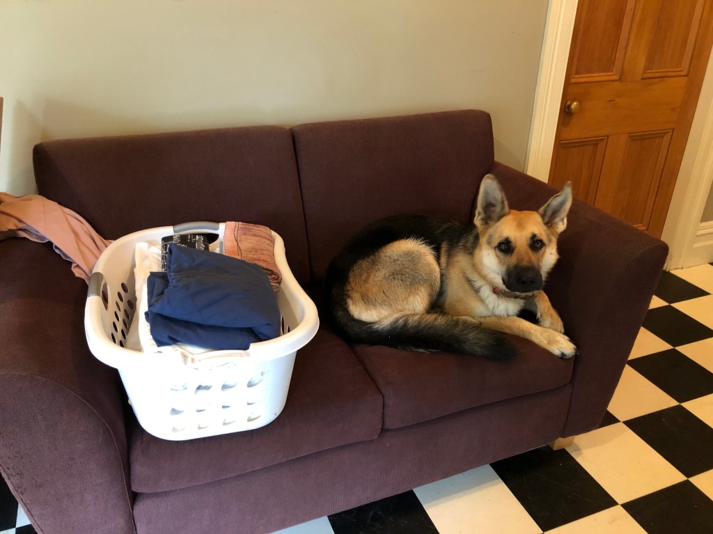 Skunky, unsere Katze, findet unseren neuen Mitbewohner nicht so toll, und bleibt bisher fern. Sie kommt nur ins Gästezimmer, das Harvey-freie Zone ist, wo sie auf dem Bett schlafen kann und wir ihr Futter hinstellen. Oder auf die Couch vor der Haustüre, wenn Harvey drinnen ist – wie heute morgen, wo wir die Zeit für ein wenig Kuscheln nutzten: