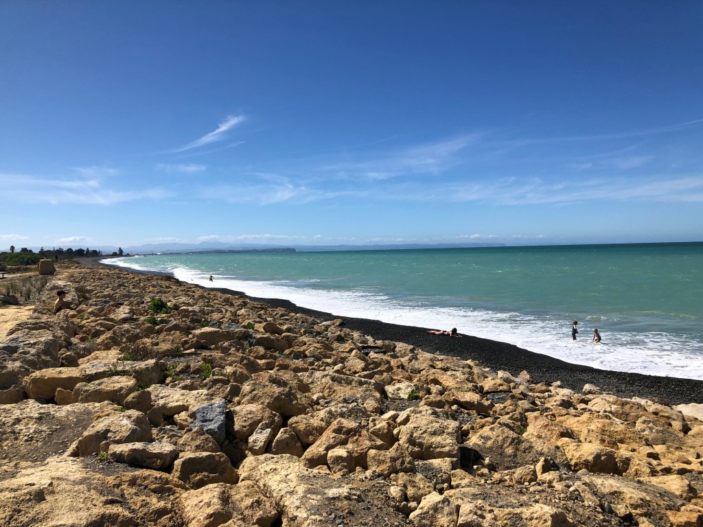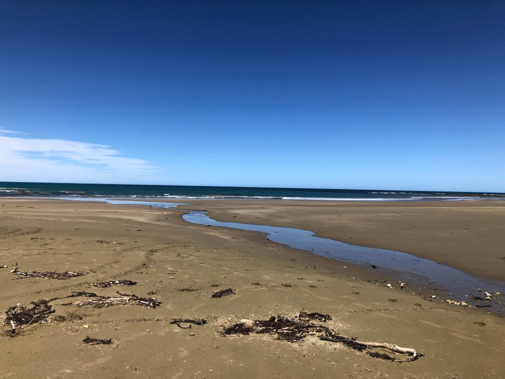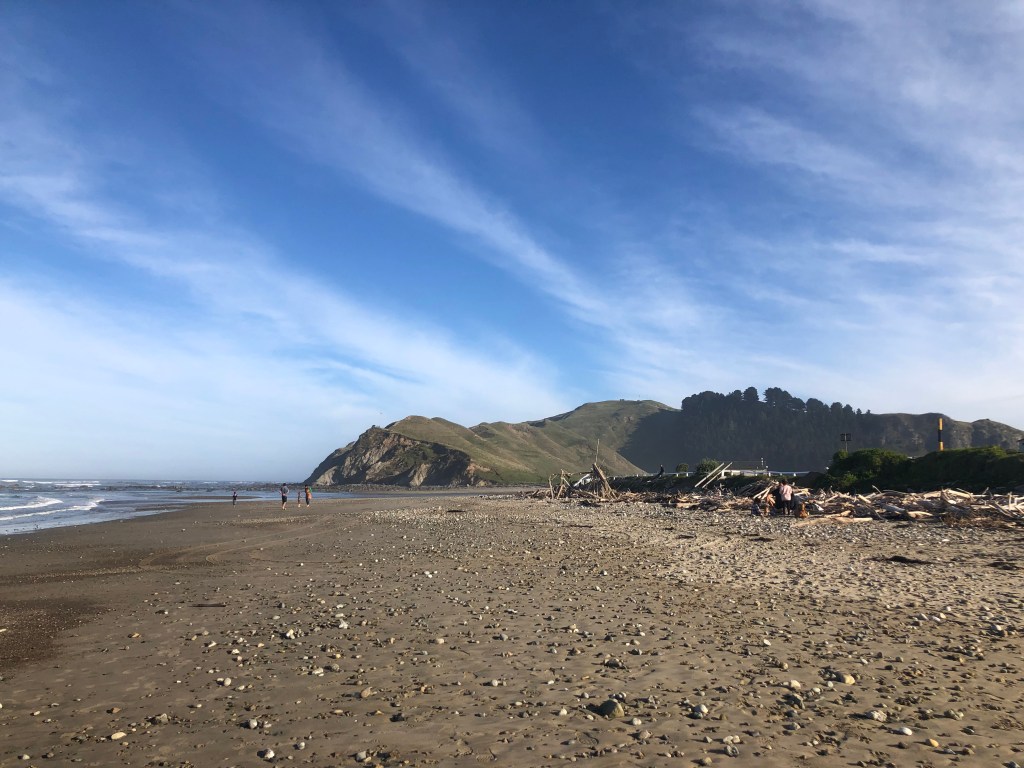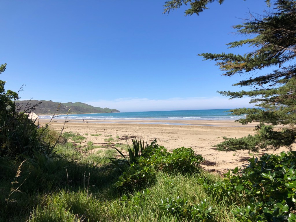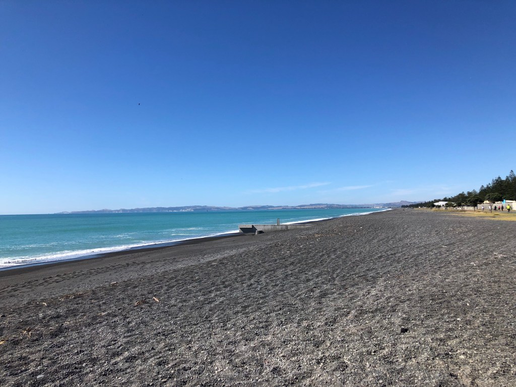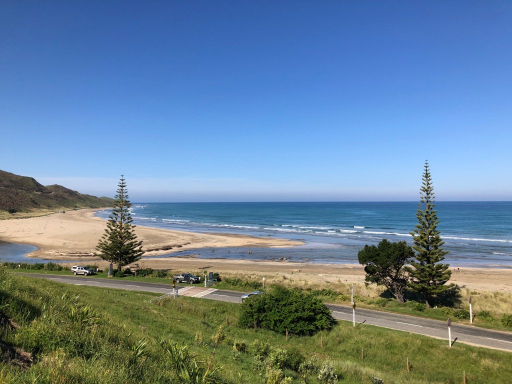 Da wir vor zwei Wochen ein paar richtig schöne, heiße Sommertage hatten, beschloss ich, von Waipawa an den Strand nach Pourerere Beach zu radeln, wo ich mich mit Paddy und Harvey treffen würde, die mit dem Truck nachkämen. So musste ich nur den Hinweg radeln, was „nur“ knapp 40 km sind, die dafür aber doch ziemlich hügelig, und da ich noch nicht wirklich fit bin, waren 400 Höhenmeter insgesamt erstmal genug, zumal es 27 Grad hatte. Aber die Tour war super!
