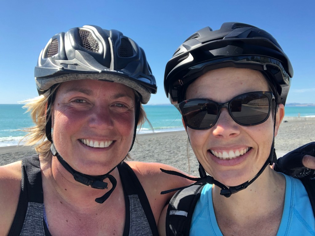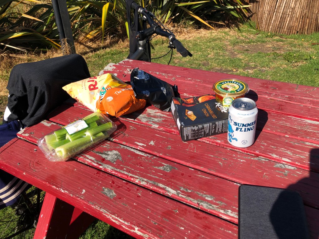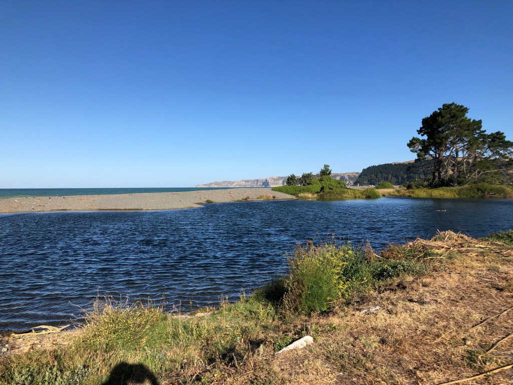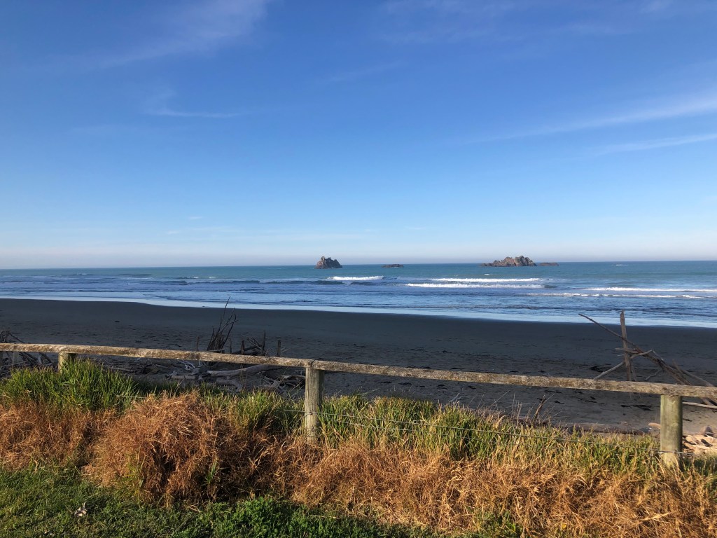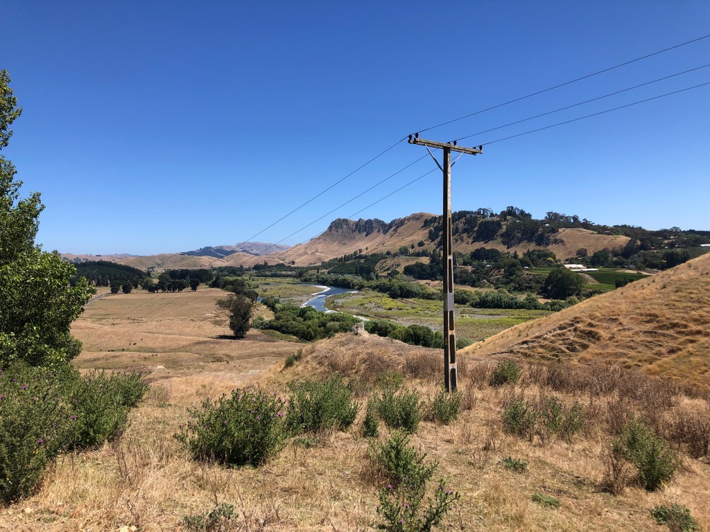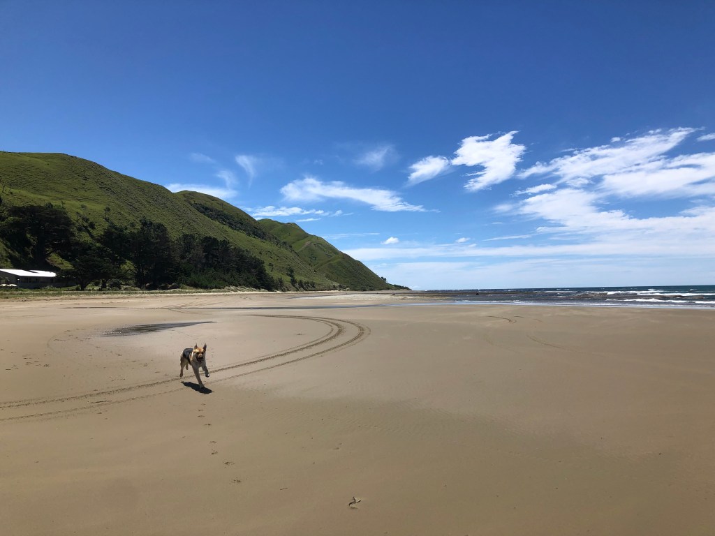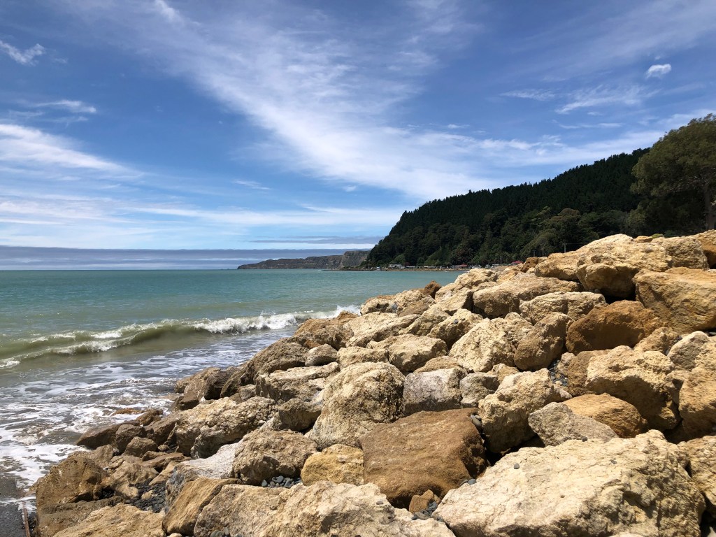 Da wir vor zwei Wochen ein paar richtig schöne, heiße Sommertage hatten, beschloss ich, von Waipawa an den Strand nach Pourerere Beach zu radeln, wo ich mich mit Paddy und Harvey treffen würde, die mit dem Truck nachkämen. So musste ich nur den Hinweg radeln, was „nur“ knapp 40 km sind, die dafür aber doch ziemlich hügelig, und da ich noch nicht wirklich fit bin, waren 400 Höhenmeter insgesamt erstmal genug, zumal es 27 Grad hatte. Aber die Tour war super!