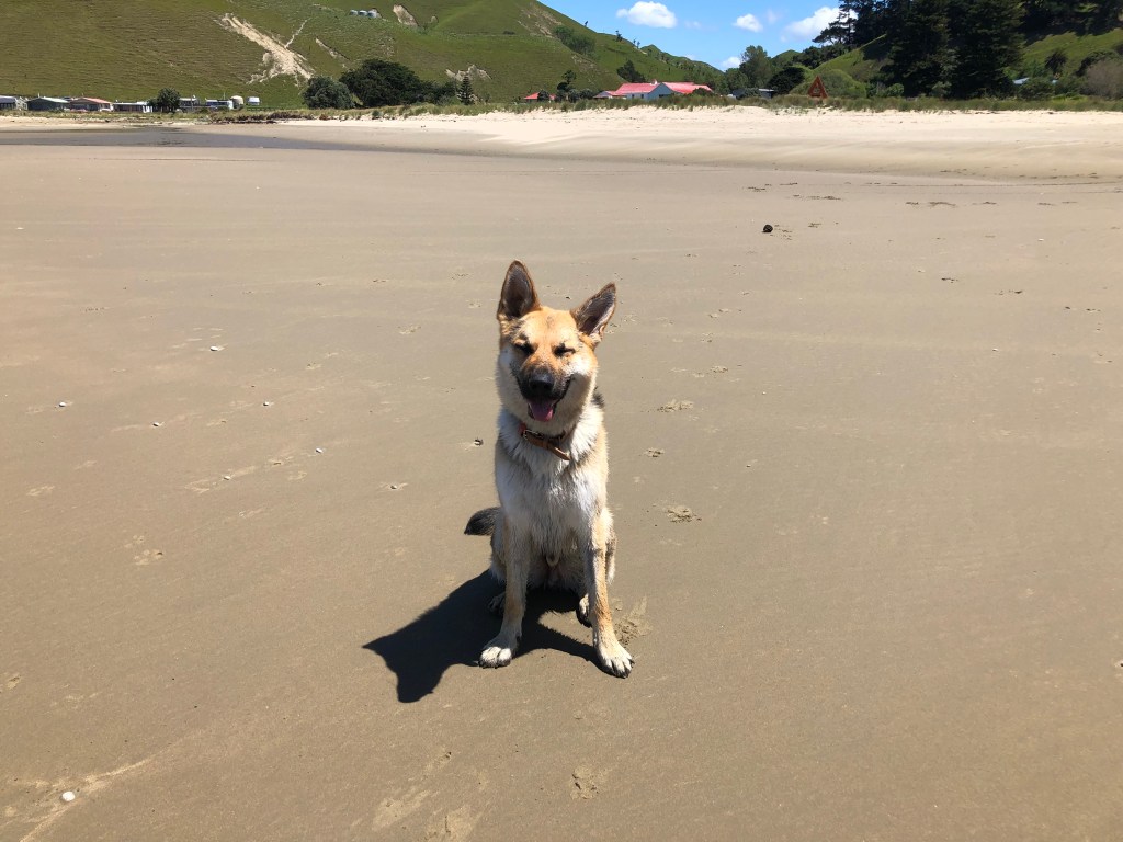 Schäferhund am einsamen Strand.„Ich bin noch nicht so sicher, wie ich das finde…“Ganz allein am Blackhead Beach.Blick aufs Meer.