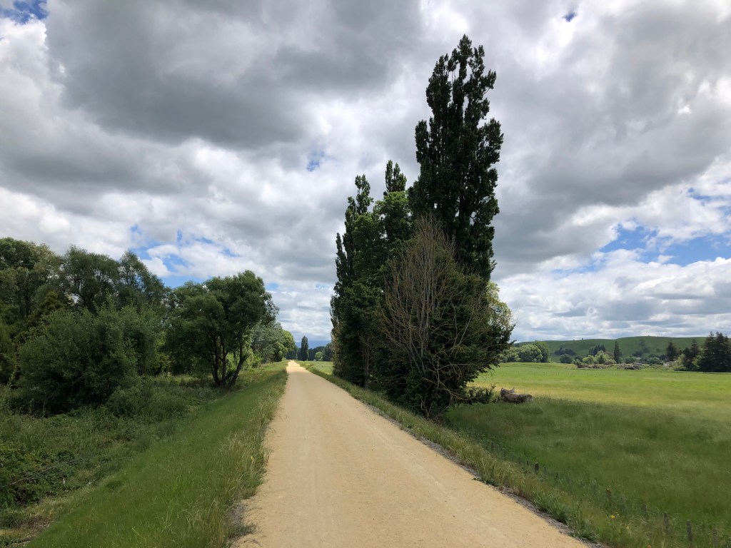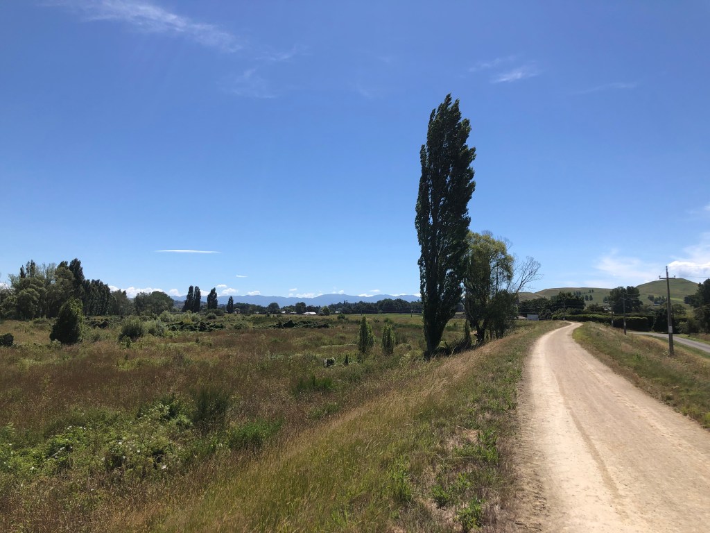 Neuer limestone track am Tukituki River entlang.Der Tukituki River, nach zahlreichen Regenfällen ziemlich hoch.Auf Nebenstraßen zurück, hier Lindsay Road mit Blick auf die Berge in der Ferne.Typisches Bild für die Gegend hier: Grüne Hügel und weiß-blauer Himmel.