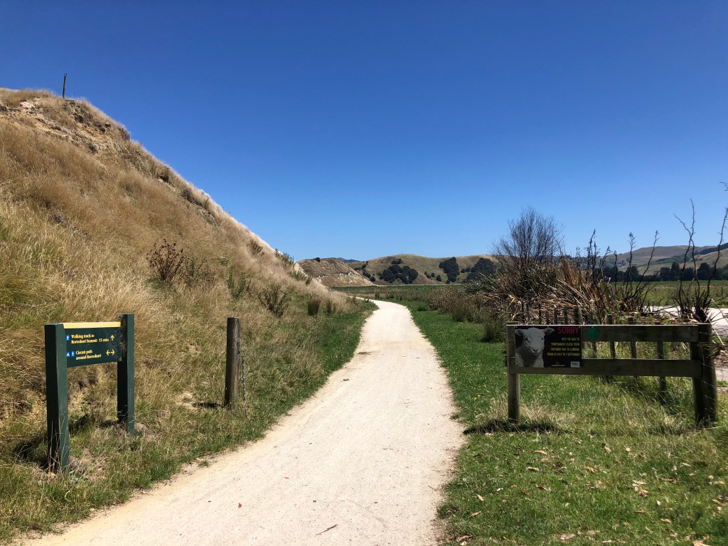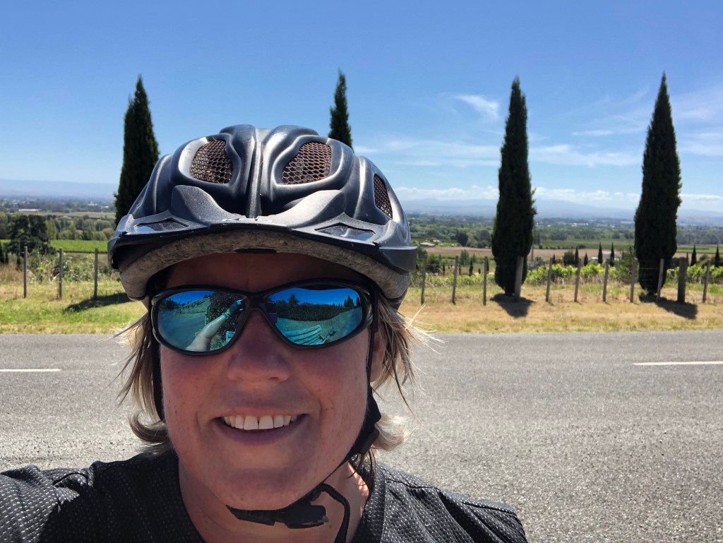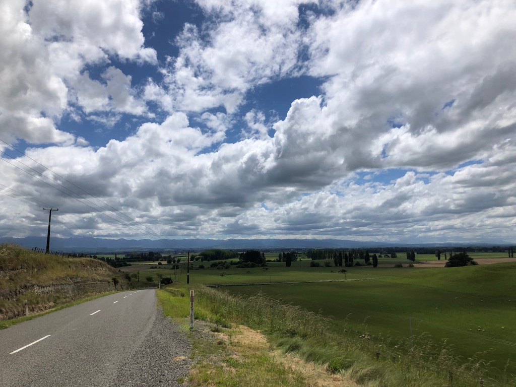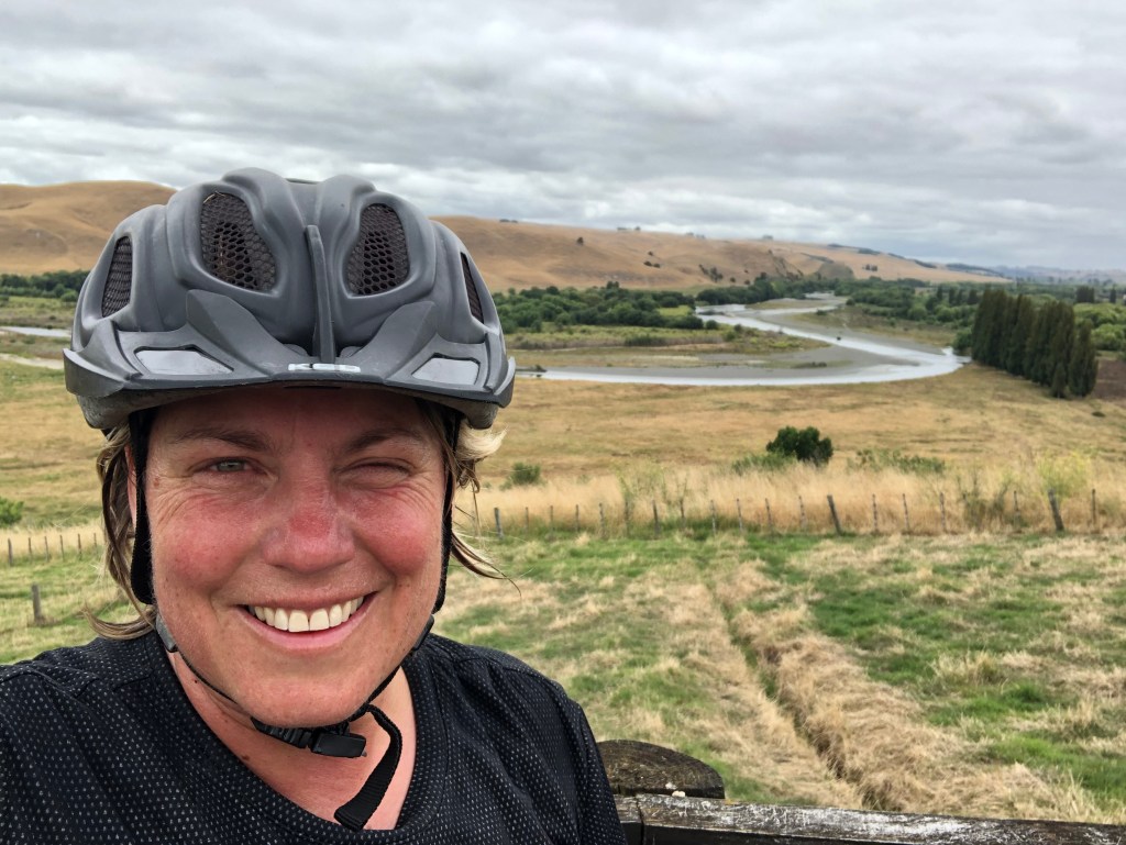 Der Tukituki River, kurz bevor es hügelig wurde.Die Hügel in der Ferne schauen aus wie mit Teppich belegt.Da kann man ein bisschen erahnen, wie hügelig es war. Kleine Hügelkette, an deren Fuß sich der Tukituki River entlang windet.Am höchsten Punkt angekommen – dafür schau ich noch ganz fit aus 🙂 Danach ging es die letzten 10 km nur noch bergab bzw. gerade.Am Meer in Clifton angekommen, von da waren es nur noch ein paar Kilometer bis zum Campingplatz.