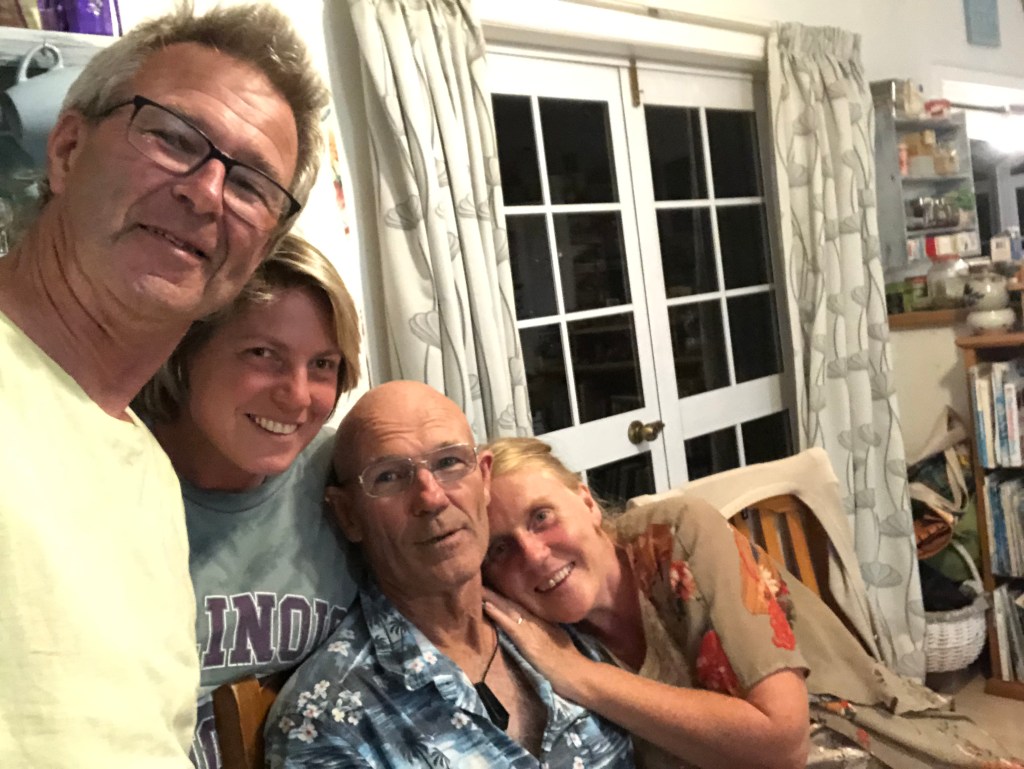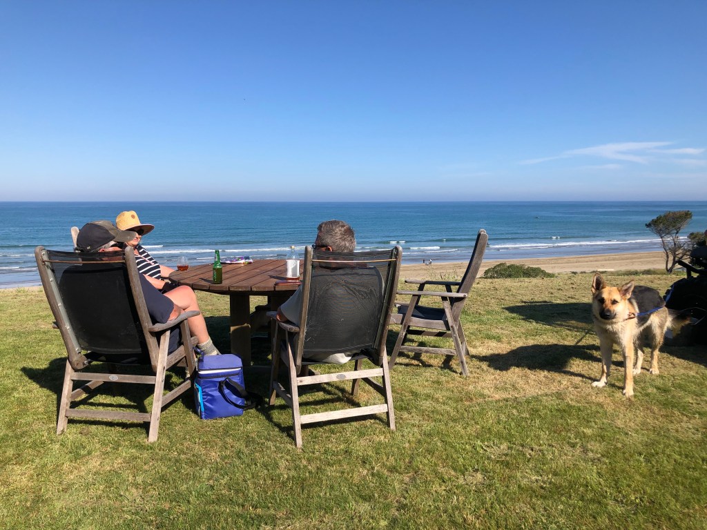 Susan, David, Paddy und Harvey mit Blick über den Strand und den Ozean.Die Aussicht von David’s und Susan’s Haus – echt sehenswert!
