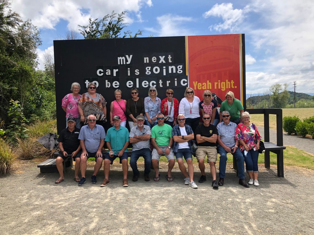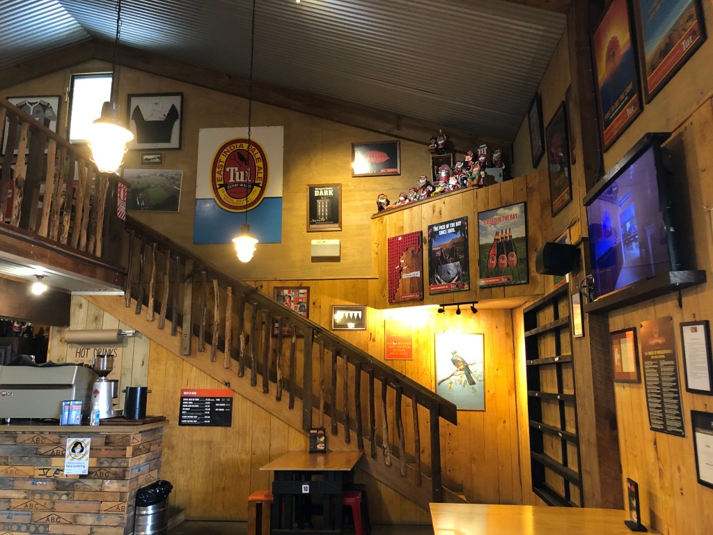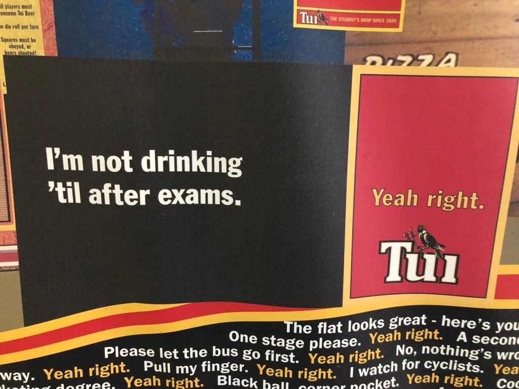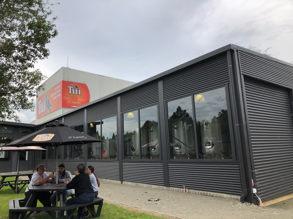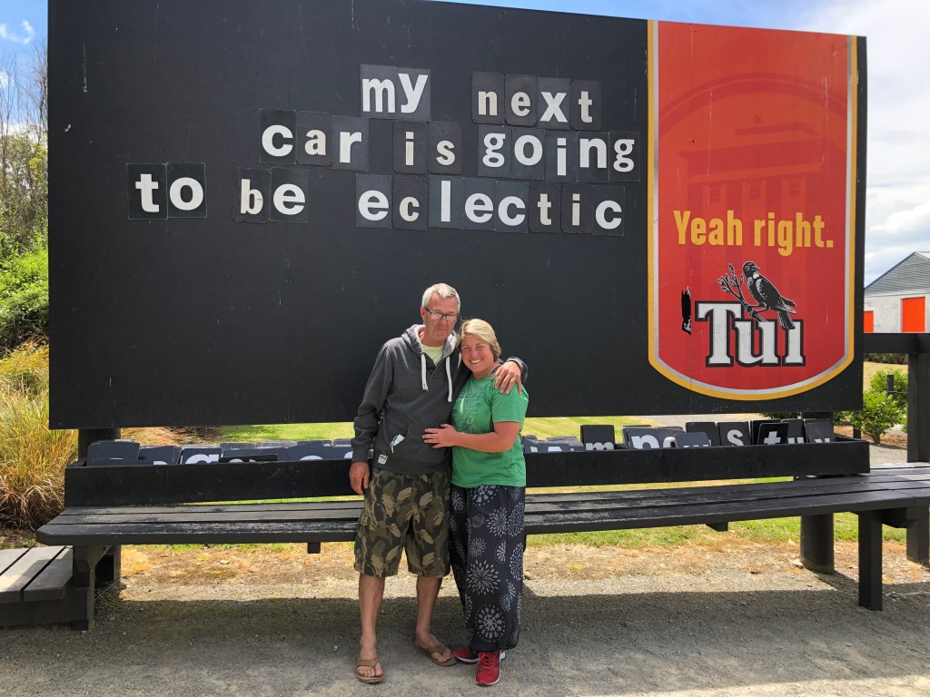 Ein Oldtimer neben dem anderen.Paddy und sein Cadillac.Das Innere der Tui-Gaststätte.Die Theke.Der Außenbereich, im Hintergrund das kleine Museum und das Restaurant, links die Brauerei selbst.Hier wird gebraut…… und zwar mit deutschen Maschinen (natürlich!) – keine Ahnung, warum das Bier trotzdem schlecht ist 😉Die ganze Truppe beim Bestellen, und da nicht für alle an einem Tisch Platz war….… saßen Aileen (Paddy’s Schwester) und Andrew…… und Paddy und ich am Nachbartisch.Hier ein Museums-Fundstück, das mir sehr gut gefallen hat. In dem kleinen Museum erfährt man mit viel Humor viel zur Geschichte der Brauerei. Zur Erklärung: der Tui ist ein neuseeländischer Vogel.Ein anderes Fundstück für meine Ex-Schüler :-). Tui ist/war für die „Yeah right“-Werbung bekannt, die echt ganz witzig ist, siehe mehr Beispiele unten im Foto. Die ganze Truppe vor einer Tafel dieser Werbung, auf der man den Text selbst gestalten kann.Paddy und ich gestalteten sie nochmal ein klein wenig um 🙂