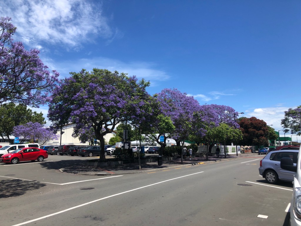 Ein bisschen Geschichte in der Stadtmitte.Ein Pohutukawa tree in der Innenstadt. Diese Bäume blühen zu Weihnachten in wunderschönem Rot, der hier fängt gerade an.Keine Ahnung, was das für Bäume sind, aber die violetten Blüten sahen toll aus!Ein kleiner Park nahe an der Uferpromenade.Das Meer hatte eine tolle Farbe an diesem Tag, da sich ein Gewitter anbahnte.Wir genossen das Meer nach unserem Einkaufsbummel.