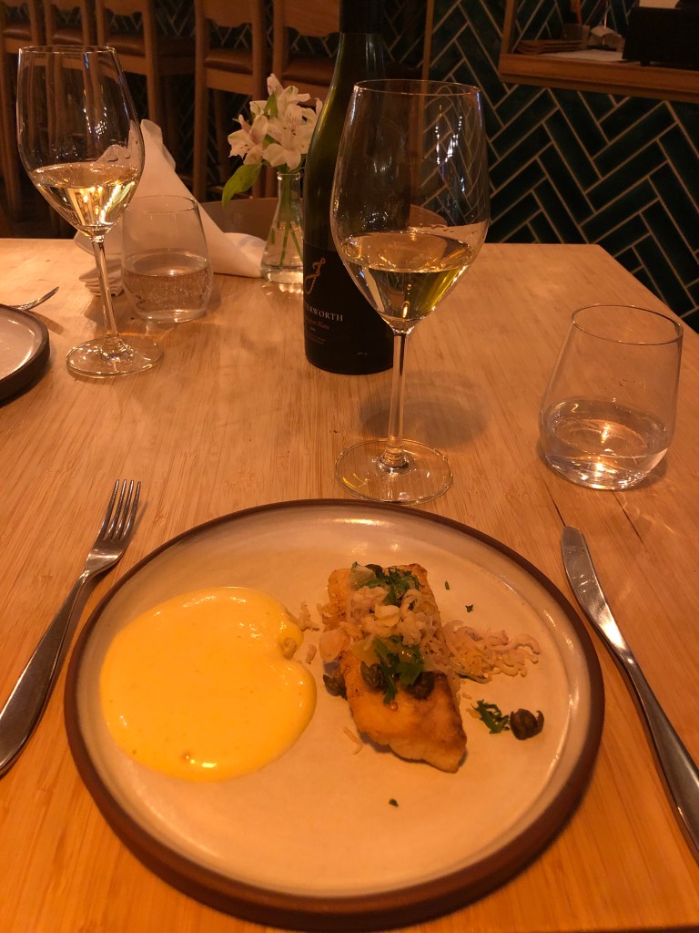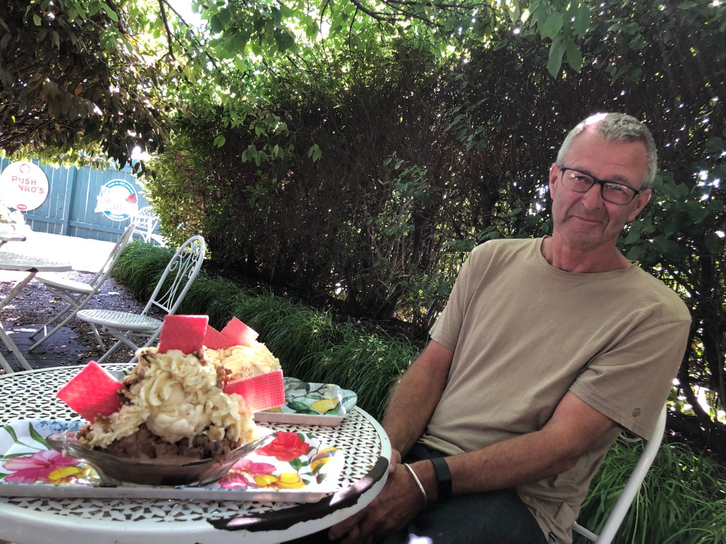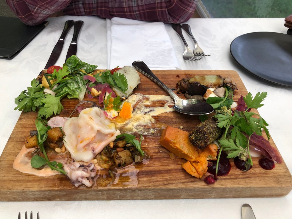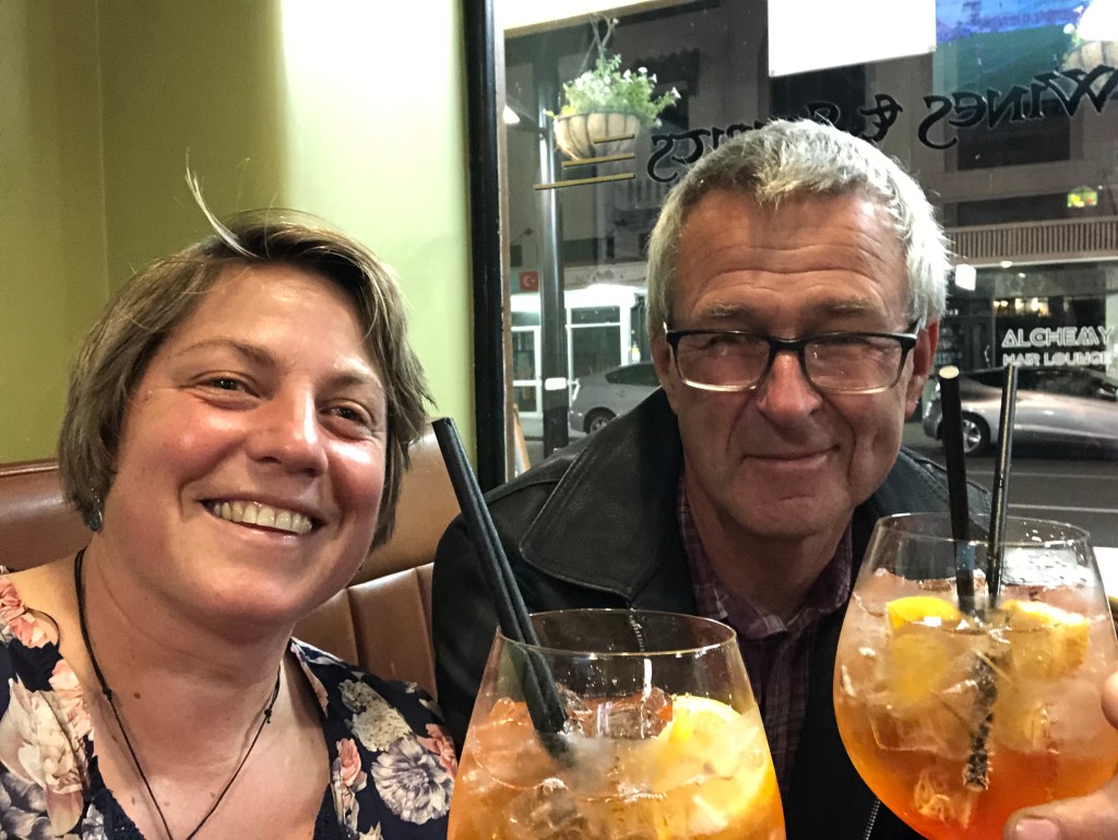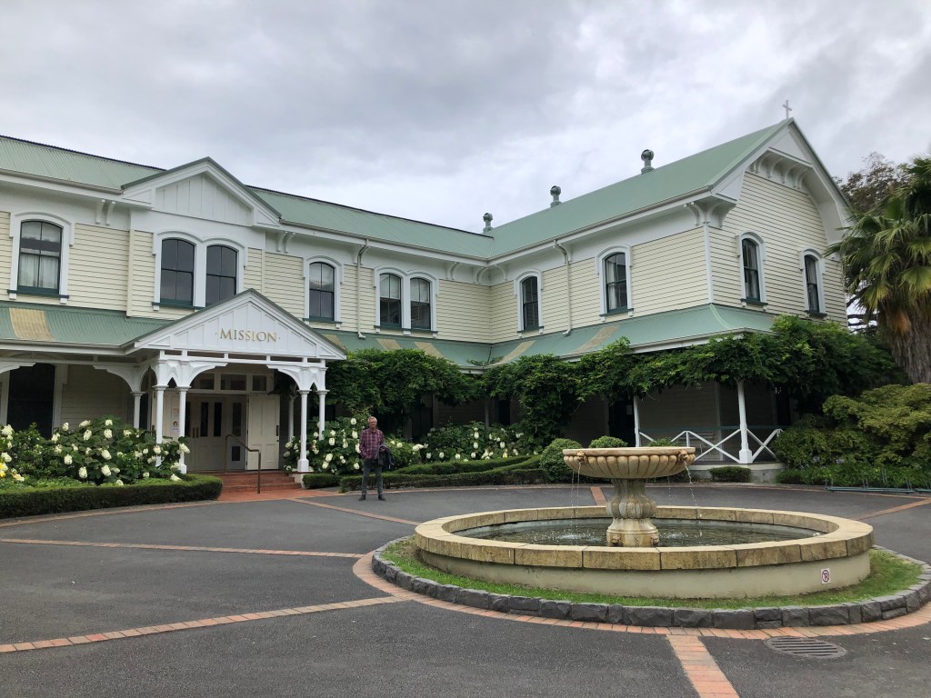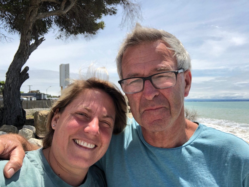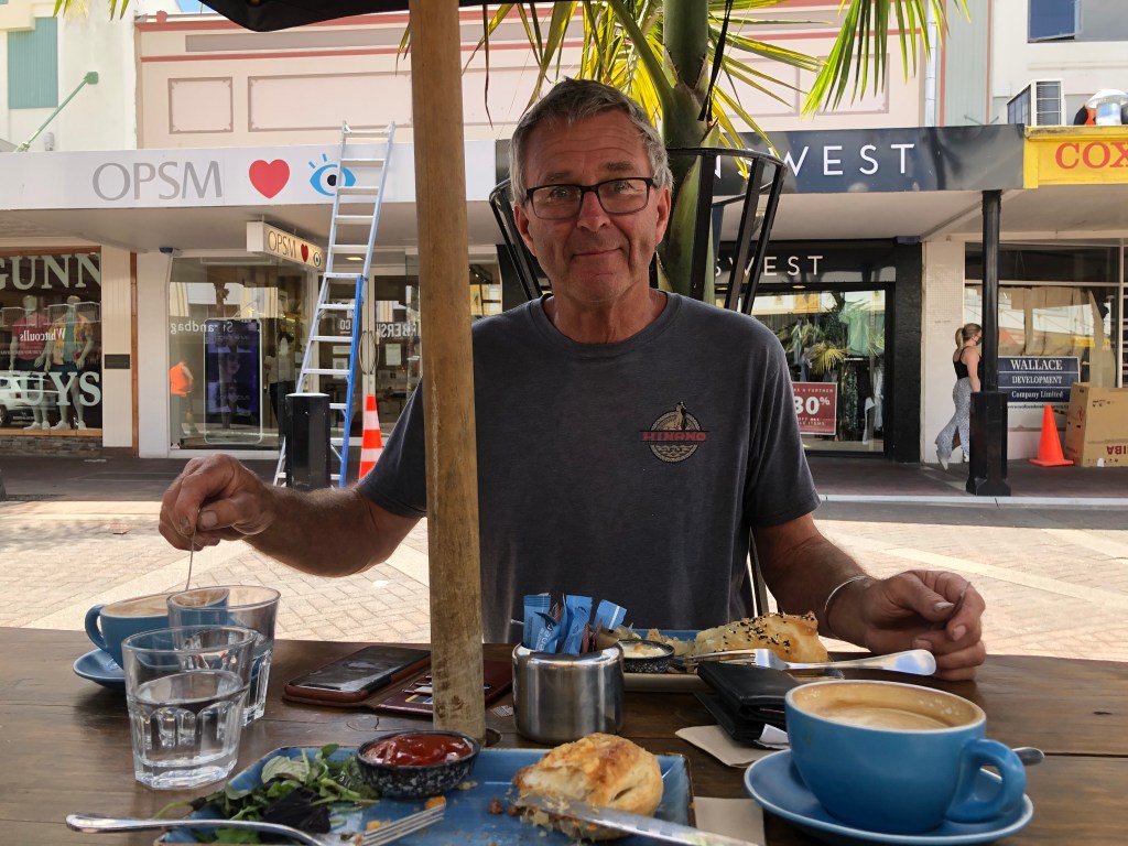 Das Geburtstagskind mit dem Geburtstagskuchen 🙂Das Meer bei Clifton, am Startpunkt zur Wanderung zum Cape Kidnappers, dessen Spitze man im Bildhintergrund noch sehen kann.Geburtstagsbild mit uns beiden am Meer.Infos zur Wanderung, die man nur zu bestimmten Zeiten (bei Ebbe) machen kann.Diese Wanderung will ich auf alle Fälle machen!!Und was macht man an seinem einzigen freien Tag seit August? Klar, man besucht einen anderen Campingplatz und quatscht mit dessen Besitzern 🙂. Das ist aber wirklich ein schön gelegener Campingplatz – und nette Besitzer!Danach gönnten wir uns einen kleinen Snack und Kaffee im schönen Cafe „Hygge“.Der birthday boy genießt seinen Kaffee mit Meerblick.Ein interessantes Haus in Napier, das wir beim Stadtbummel fanden.Blick über den Hafen vom Bluff Hill in Napier – leider zogen am Horizont dicke Wolken auf, so dass man in der Ferne nicht viel sehen konnte.Paddy am Bluff Hill.Die Mission Estate Winery, wo ich uns einen Tisch fürs Abendessen reserviert hatte.Blick von der anderen Seite, rechts ist das Restaurant.Blick vom Haus über die Weinreben.Wir starteten erstmal mit einem Aperol Spritz.Als Vorspeise hatten wir eine gemischte Platte bestellt – keine Ahnung, was das alles war, aber es war unglaublich lecker!Als Hauptgericht hatte ich Lamm bestellt – sooooo gut!!Paddy hatte den Fisch bestellt, der war auch phantastisch!Und natürlich darf in einer Winery der Wein nicht fehlen, auch der war sehr lecker!