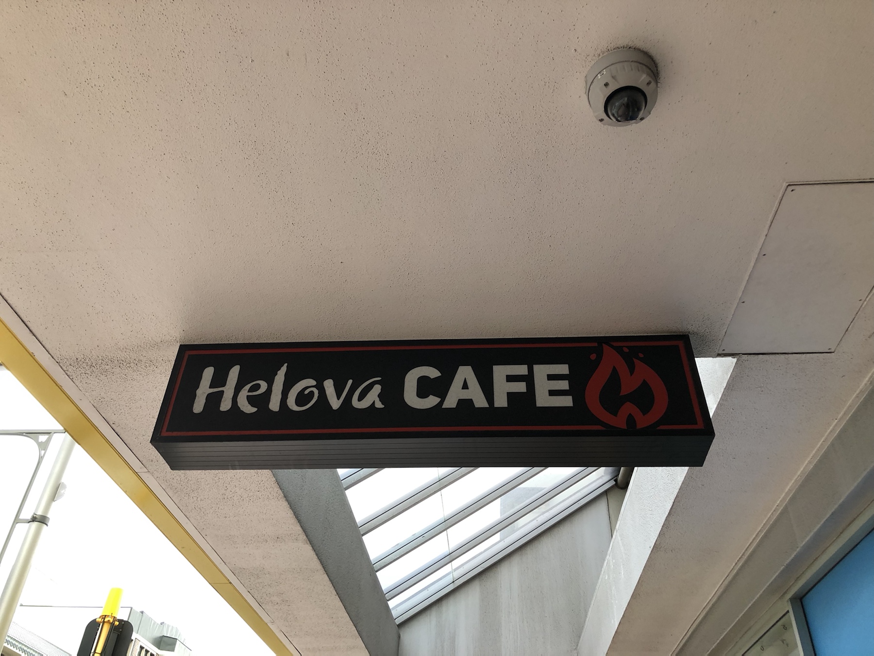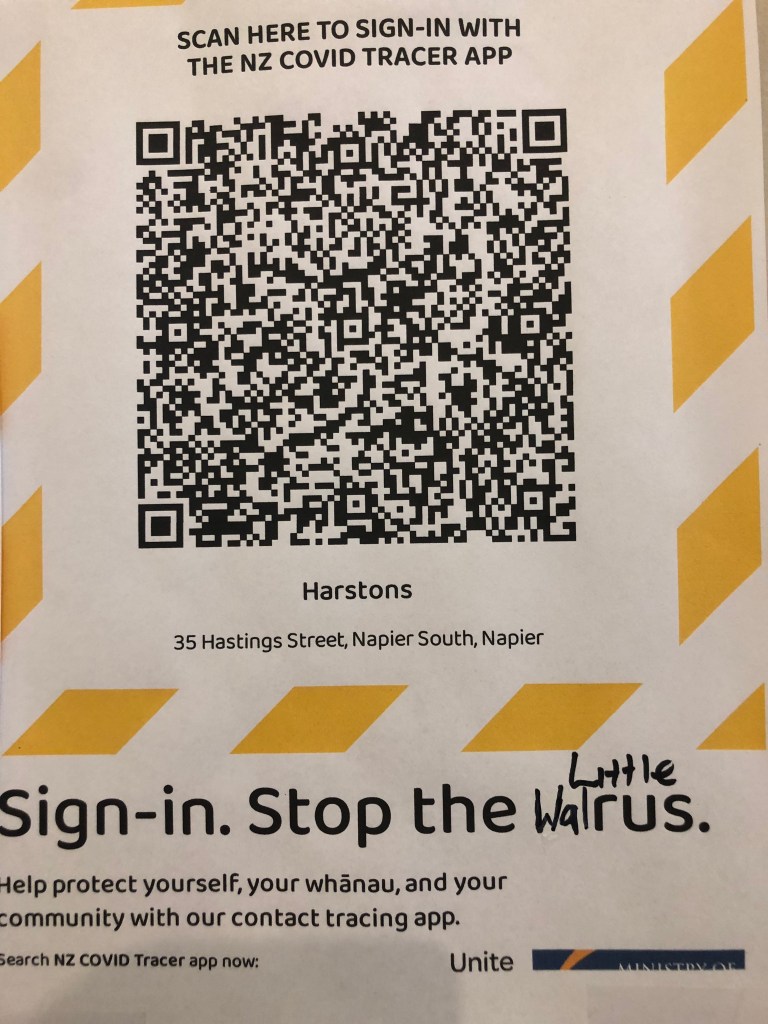 Paddy mit Kaffee und Mittagessen.Wie in Deutschland mit der Luca-App muss man sich auch hier einscannen, so dass man diese Schilder überall findet. In einem Musikgeschäft war jemand kreativ und hat es etwas abgeändert 🙂