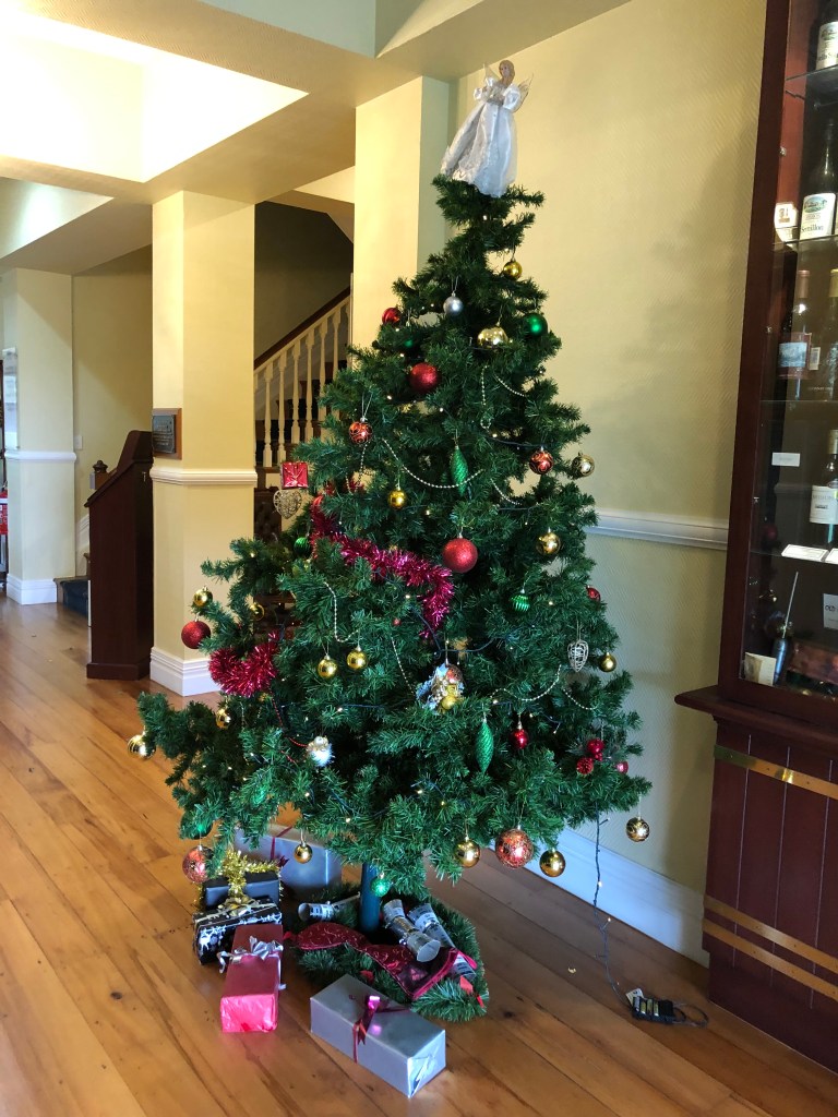 Sperrholz-Christbäume in Waipawa.Christbaum mit Adventskranz- und Rentierschmuck in Napier.Überdimensionierte Christbaumkugel in der Fußgängerzone in Napier.Spartanischer Weihnachtsschmuck, aber dafür reichlich Geschenke unterm Baum 😉Der vielleicht europäischste Christbaum, den ich gefunden habe – bis auf den Engel auf der Spitze.