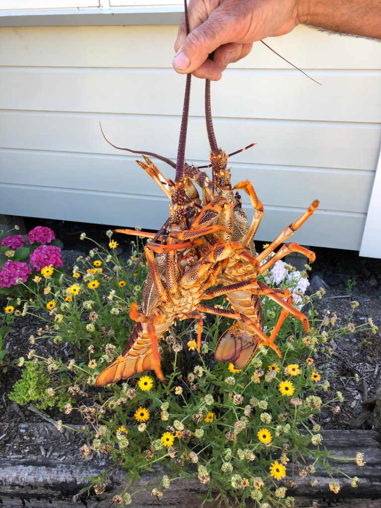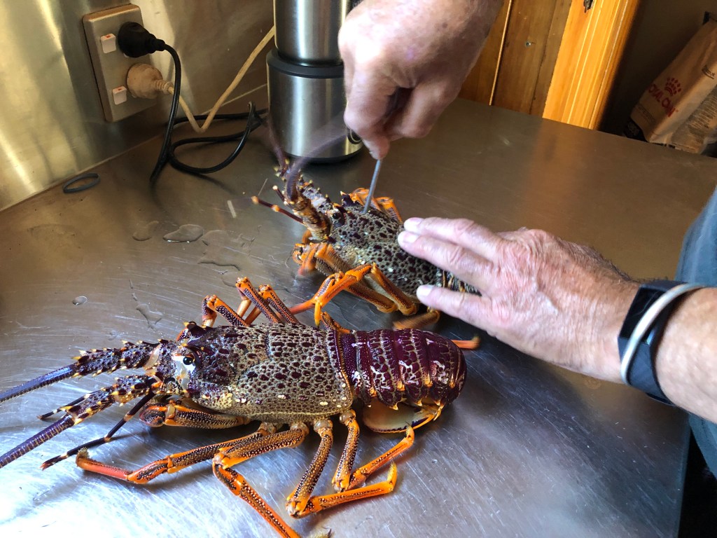 Paddy’s Freund sagte, wir sollten sie in einen Eimer voll Wasser stecken, dann würden sie ertrinken. Wir taten das erstmal, aber da ich das total unlogisch fand, weil sie ja im Wasser (wenn auch in Salzwasser) leben, googelte ich das und fand heraus, dass es zwar stimmt, aber kein schöner Tod ist. Empfohlen wird stattdessen, sie erst einzufrieren und dann mit einem Spieß gezielt in das Herz, das am ganzen Rücken ist zu stoßen und zu töten. Zum Glück übernahm Paddy das, ich hätte es nicht gekonnt! Aber geschmeckt haben sie dann echt klasse! Leider habe ich von den gekochten Langusten kein Foto mehr gemacht.