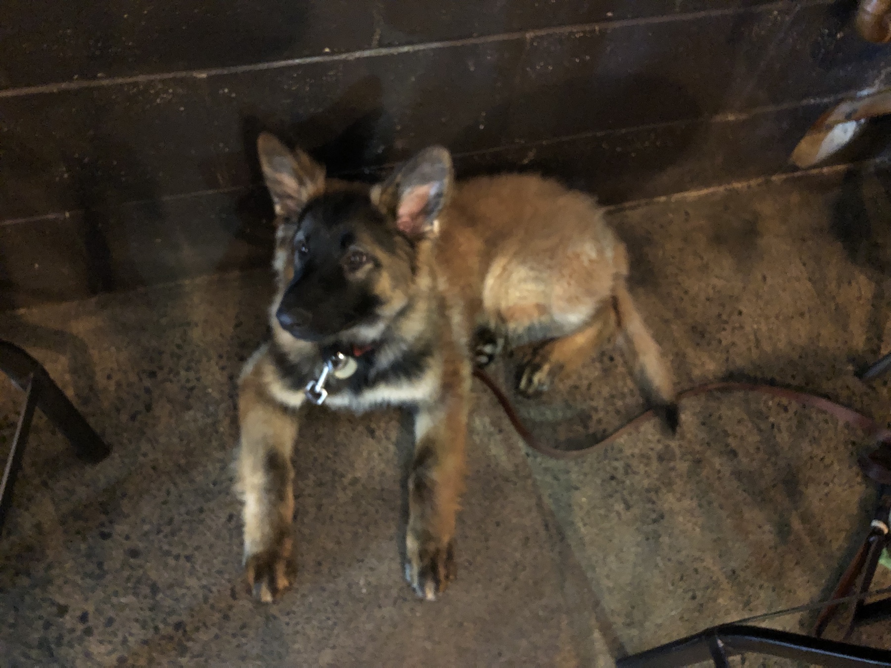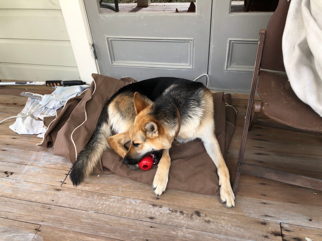 Danach ist er dann völlig erledigt und schläft am liebsten zu unseren Füßen unter dem Küchentisch:
