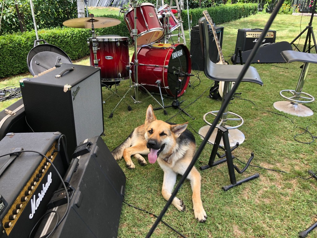 So sieht ein glücklicher Hund aus – völlig nass und im Wasser 🙂Meine beiden Männer beim „Bonding“ im Garten.Familienfoto.