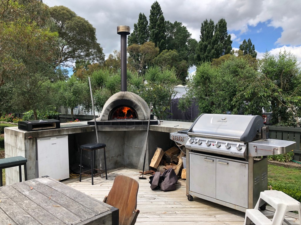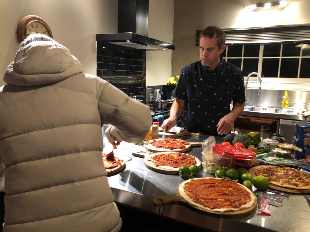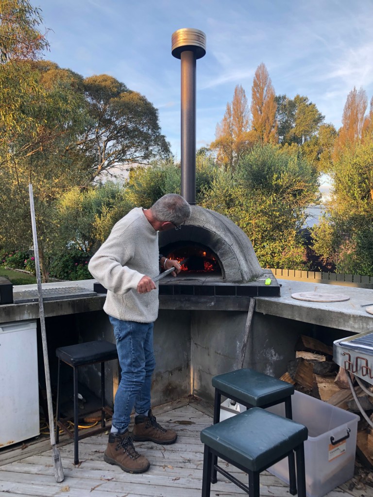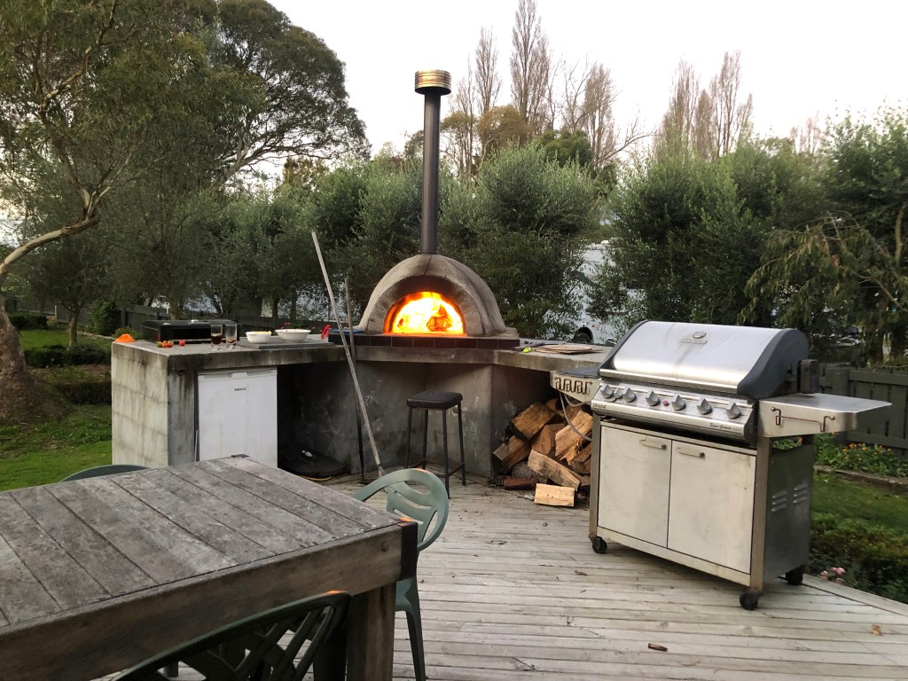 Letztes Wochenende haben wir das erste Mal den Pizzaofen eingeheizt, und es gab frische Pizza mit allen möglichen Belägen mit unseren Freunden Paula und Steve und Sohn Tommy – sehr lecker!