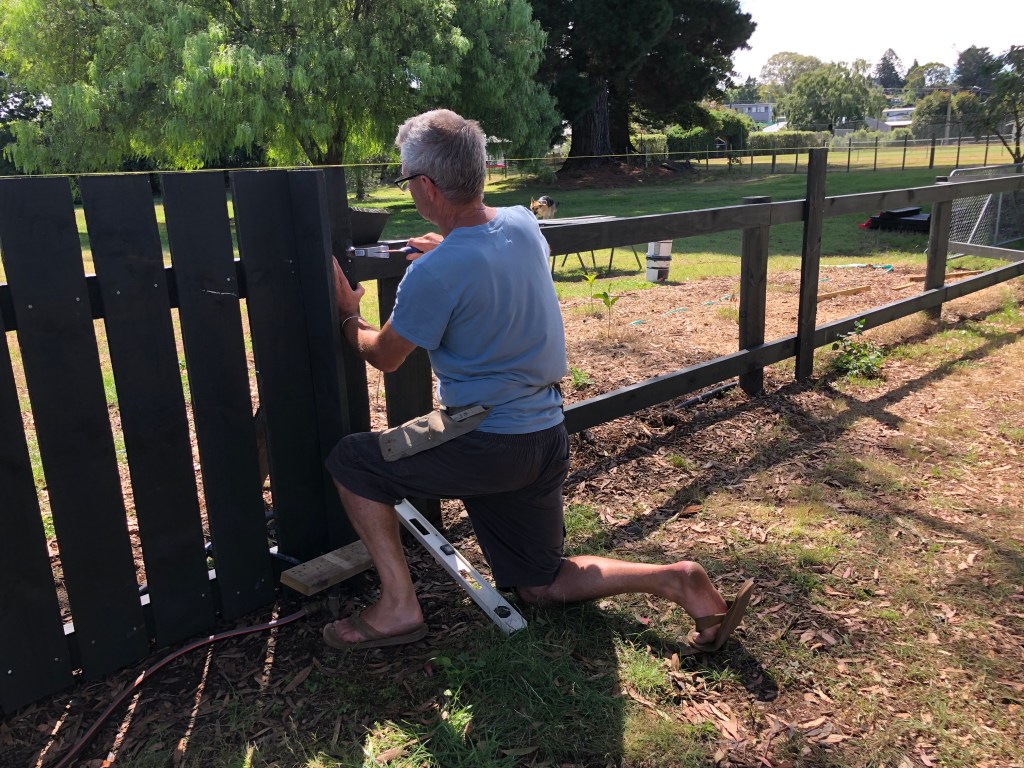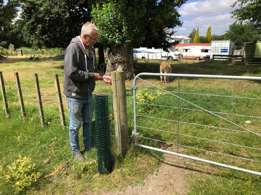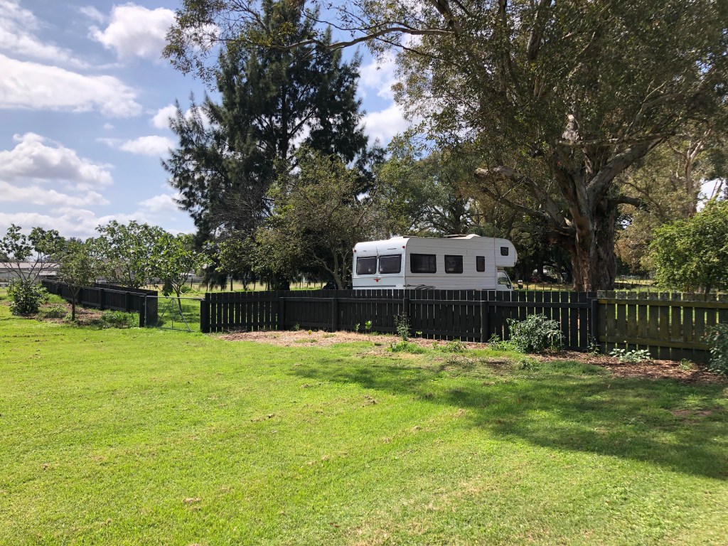 Neben dem Zusammenstellen der Papiere für das Visum gab es die letzten Wochen noch zahlreiche andere Dinge zu erledigen, wir waren ziemlich gut beschäftigt! Zu allererst wollten wir unbedingt unser Grundstück komplett fertig einzäunen, damit Harvey, unser Hund, nicht ausreißen oder im Camp frei herumlaufen kann. Leider fing er nämlich an, nicht nur auf dem Campingplatz herumzulaufen, sondern weitete seine Solo-Spaziergänge auf außerhalb des Holiday Parks aus, und das wurde uns zu gefährlich, da er leider keine Angst vor Autos oder LKWs hat – im Gegenteil, er jagt sie (zum Glück bisher nur unter der Brücke, wenn sie darüber fahren). Und so machten wir uns in Windeseile an die Fertigstellung des Zauns und das teilweise provisorische Stopfen einiger Schlupflöcher, bis wir mehr Zeit haben, eine Dauerlösung zu finden. Hier ein paar fotografische Beweise unserer Arbeit: