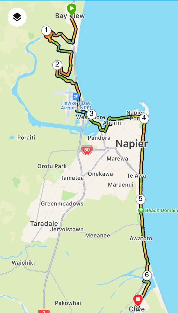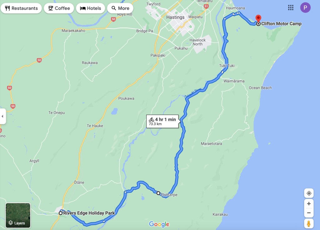 Die Tour auf der Karte.Blick auf den Tukituki River, den man nach ca 10 km überquert.Noch grüne Hügel – bald werden sie gelb bzw. braun sein.Kurze Verschnaufpause im Schatten.Yayyy, höchster Punkt erreicht, endlich der Blick aufs Meer – von da an geht es fast nur noch bergab, in teilweise rasanten downhills (Höchstgeschwindigkeit 62 km/h).Geschafft! Blick auf Pourerere Beach.Und bald darauf kamen auch Paddy und Harvey an – hier mal wieder ein Bild ohne Hund.