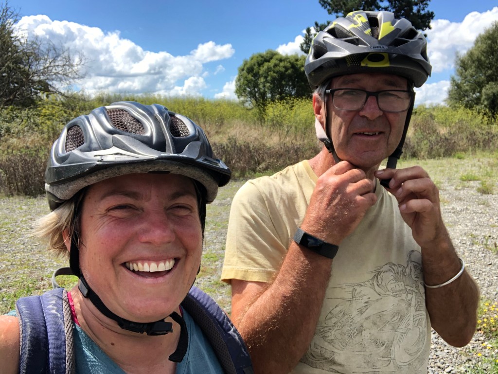 Paddy mit seinem neuen Rad auf dem Tukituki Radweg.Der Tukituki River.Die beiden Biker 🙂