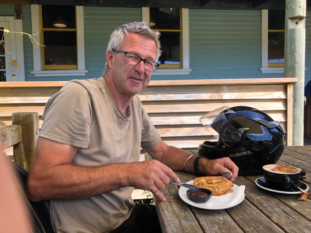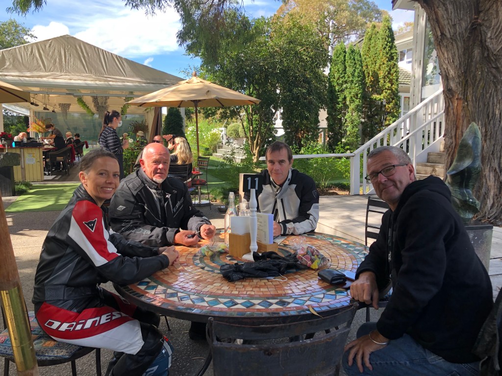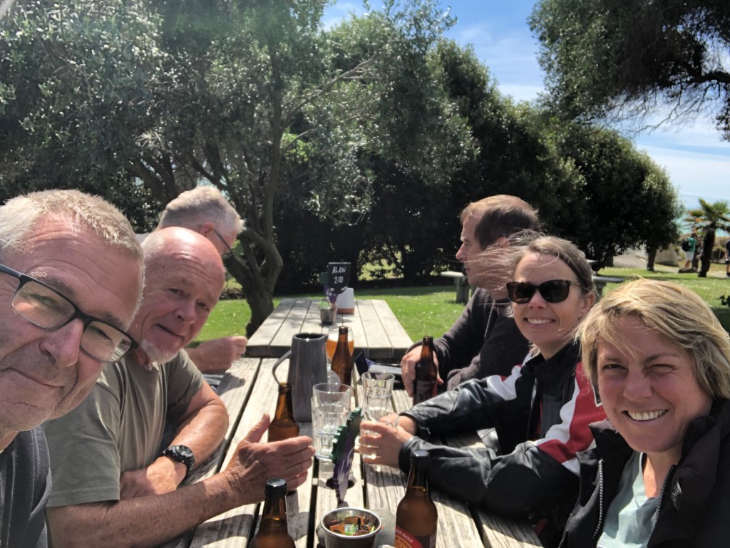 Nochmal den Pizza-Ofen einheizen und draußen auf dem Deck sitzen: Glyn, Steve, Paddy, Lyn und Paula.Der Pizzabäcker 🙂Motorbike-Tour nach Clifton, hier beim Lunch im Café Hygge: Paddy, Glyn, Mark, Steve, Paula und ich.Auf dem Rückweg gab es eine kurze Kaffeepause im „Birdwoods“.