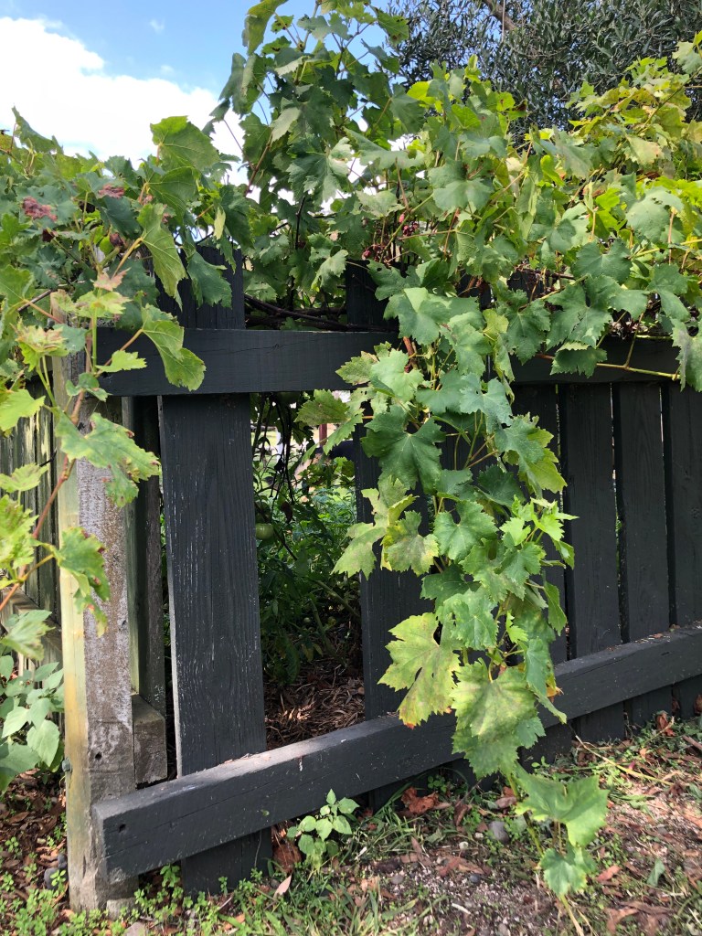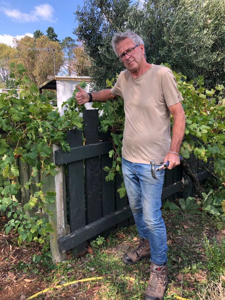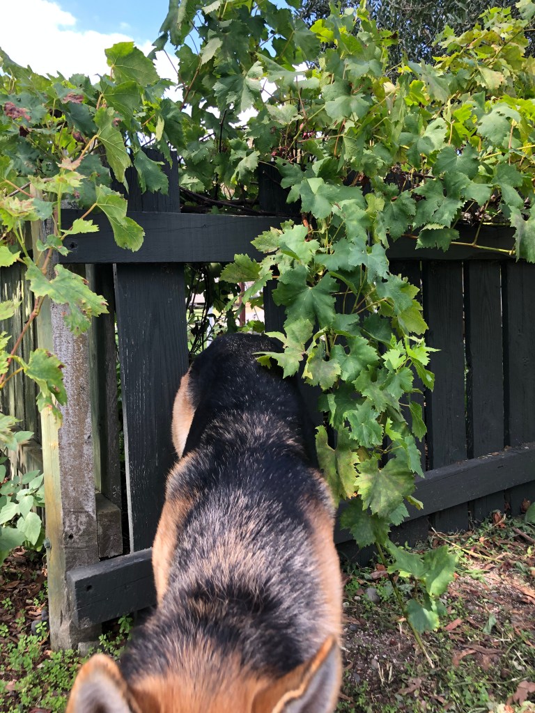 Eine fehlende Latte im alten Zaun,versteckt hinter Weinreben(fürs Foto und die Reparatur haben wir die zur Seite geschoben).Groß genug für unseren schlanken Hund zum Durchlaufen, wie er uns hier bewies.Loch gestopft 🙂Harvey findet das nicht so toll und beschwert sich bei Paddy 😉