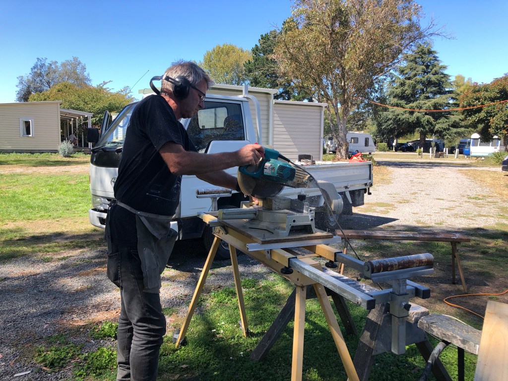 Nachdem alle Vorbereitungen für die RSE workers abgeschlossen und diese eingezogen waren, hatte Paddy endlich Zeit, eine Wand für Sams Wohnwagen-Anbau zu bauen. Sam ist einer unserer permanents und hilft uns auf dem Campingplatz. Bisher hatte er nur eine Plane als Wand, inzwischen steht die neue, solide Holzwand, der Winter kann kommen 😉