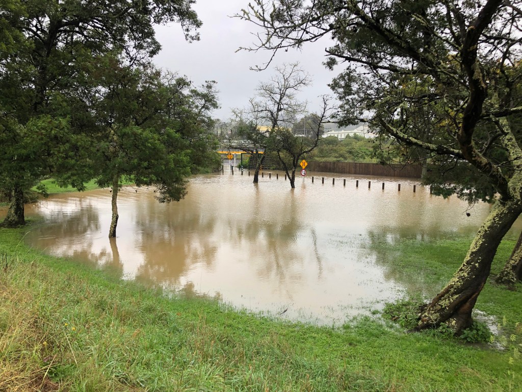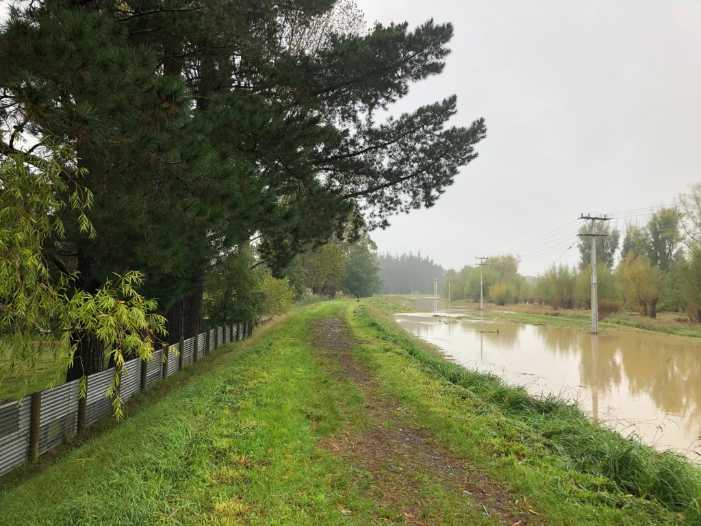 Das Wasser reichte bis zum Damm, links davon ist unser Campingplatz. Normalerweise kann man den Fluss vom Damm aus noch nicht mal sehen!Der reißende Waipawa River reicht fast bis an die Straße ran.