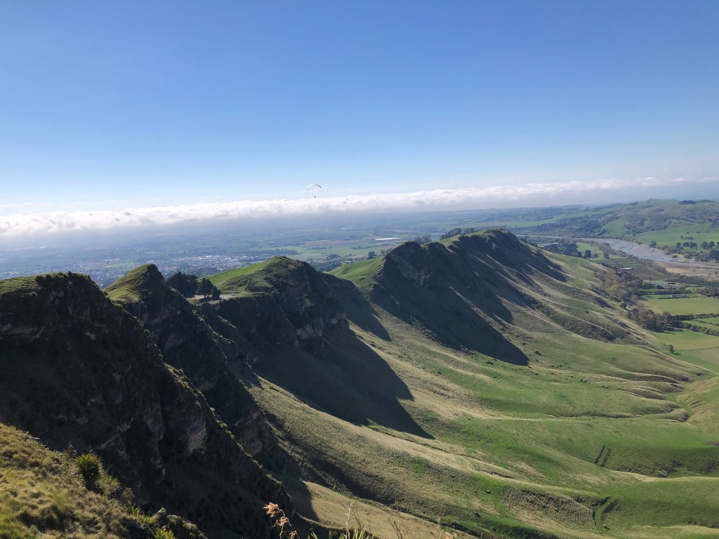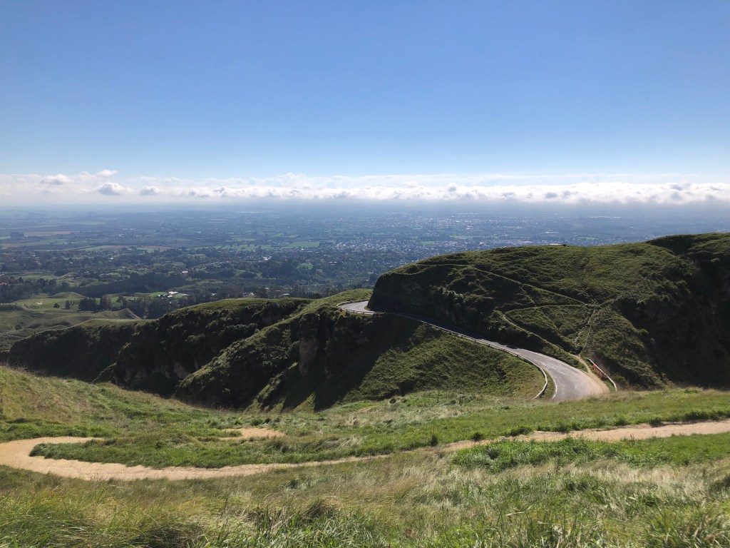 Zum Glück folgt nach Regen auch irgendwann wieder Sonnenschein, und die letzten paar Tage waren trocken, warm (bis 24 Grad) und sonnig, so dass wir jede Menge Rasen mähen konnten – und mussten! Am Sonntag nahmen wir uns nach dem Putzen den halben Tag frei und fuhren zum Te Mata Peak, einem Berg bei Havelock North. An diesem Tag waren wir faul und fuhren mit dem Auto hoch, aber nachdem ich die Hiking- und Mountainbike-Trails gesehen habe, will ich auf alle Fälle wieder dort hin und sie ausprobieren! Hier ein paar Eindrücke von unserem Sonntagsausflug bei schönstem Wetter: