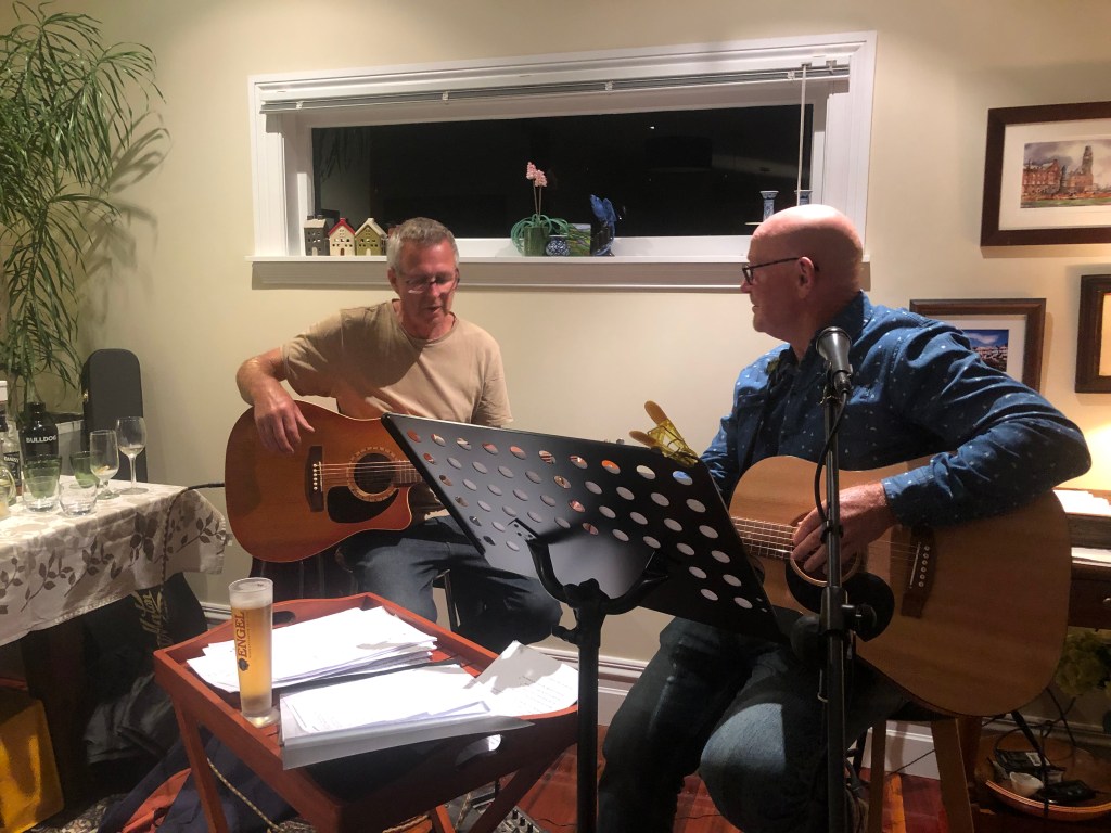 So viel zum inzwischen echt leidigen Thema Covid. Was haben wir sonst so angestellt in den letzten Wochen? Vor ein paar Wochen habe ich Paddy’s Band das erste Mal live bei einem Auftritt gehört, der zwar einen traurigen Anlass hatte – es war die Gedenkfeier für die Mutter des Sängers, die gerade an Krebs gestorben war – aber das hält die Leute hier nicht vom Tanzen und Feiern ab. Es war ein wirklich schöner Abend! Da die Tonqualität nicht so sonderlich gut war, hier nur ein Bild, und ein Video von dem Lied, das Paddy und Harry in der Kirche gespielt haben (hier die Übungsversion bei uns in der Küche):