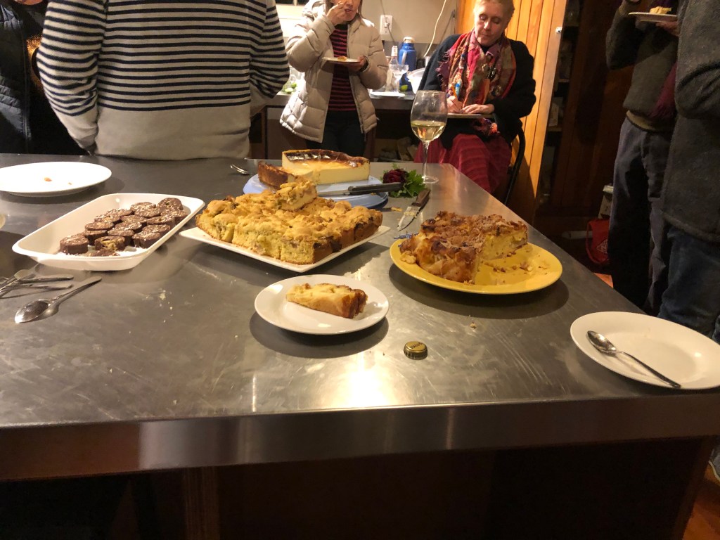 Paddy und ich.Stolzer Vater mit Tochter 🙂Die ganze Geburtstags-Runde beim Happy Birthday-Singen mit Geburtstagskuchen im Vordergrund.Jede Menge leckerer Kuchen – inklusive Berrit’s Käsekuchen und Wendy’s Chocolate slices!Später am Abend endete die Party gemütlich im Wohnzimmer, und Harvey war wie immer „center of attention“, hier verwöhnt von Livi.