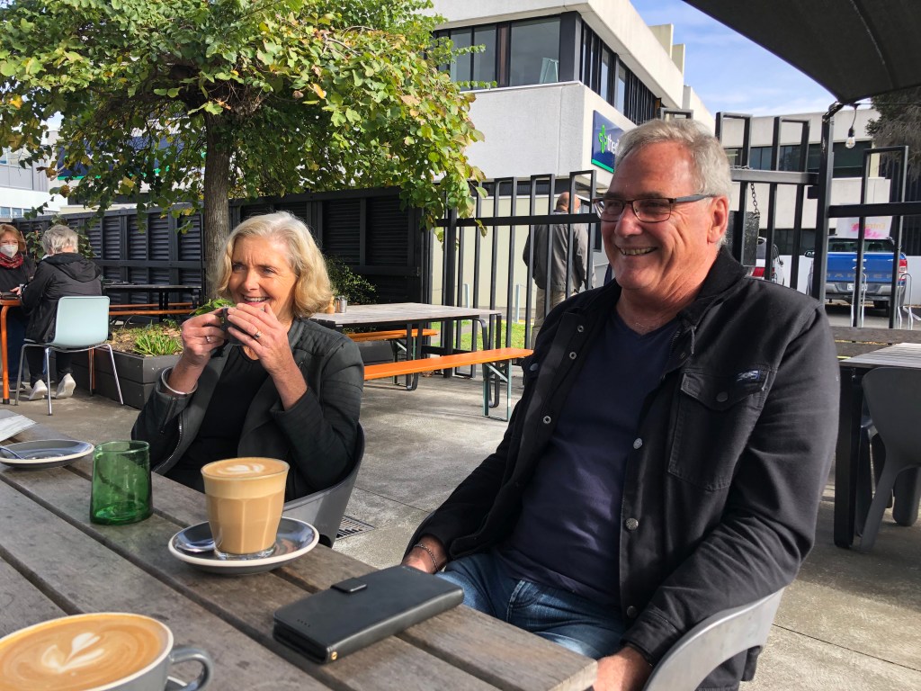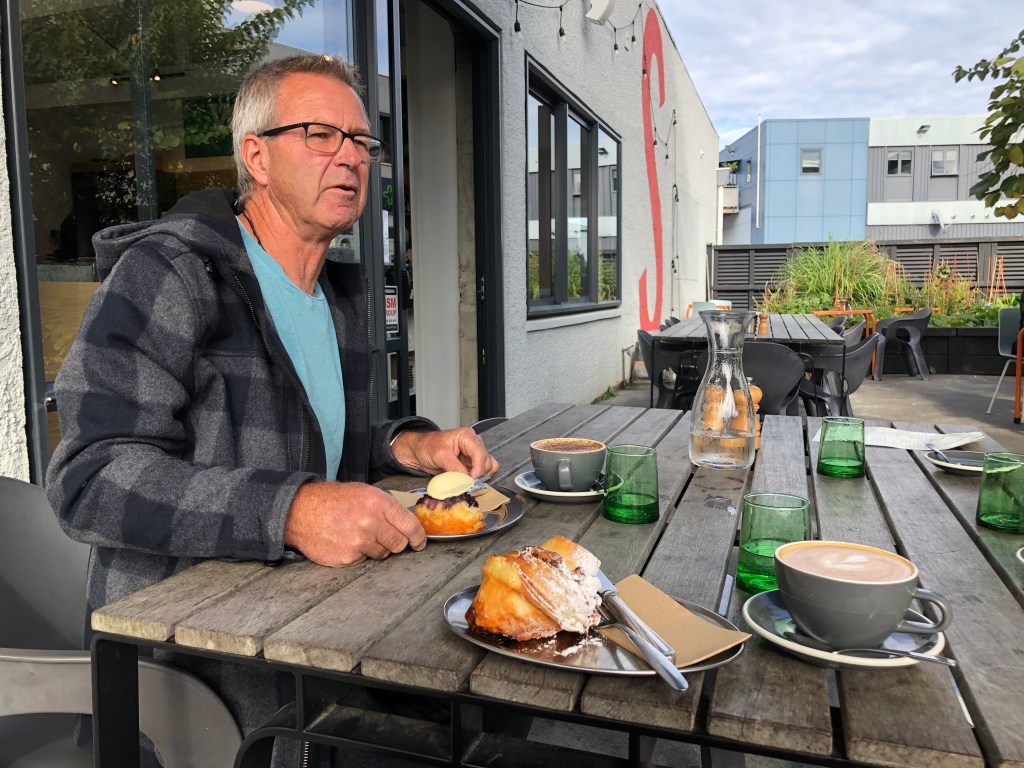 Am nächsten Morgen waren wir zum Frühstücken mit Paddy’s Freunden Baz und Jane verabredet, und da das Wetter so schön war, konnten wir sogar draußen sitzen. ich hatte ein superleckeres Schoko-Croissant, etwas, das es hier nicht oft gibt!