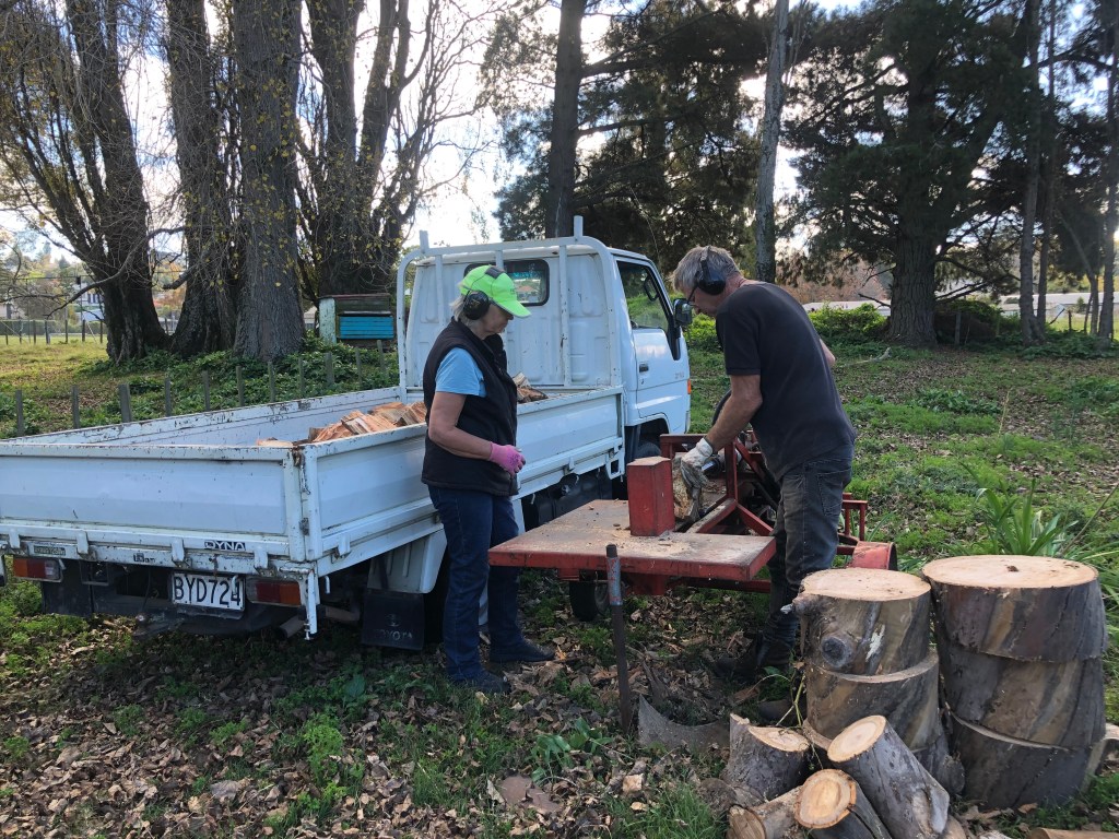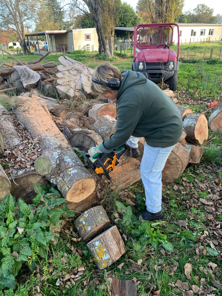 Die letzten zwei Wochen hatten wir tolles Wetter, jeden Tag Sonnenschein und Temperaturen zwischen 15-21 Grad, aber die Tage werden merklich kürzer, inzwischen wird es schon vor 17.30 Uhr dunkel. Im Winter gehen hier die Temperaturen tagsüber runter auf 12-16 Grad (selten bleibt es unter 10 Grad), in der Nacht meist zwischen 3-6 Grad, selten kann es auch mal Frost geben. Das klingt jetzt verglichen mit Winter in Deutschland nicht so dramatisch, aber hier sind die Häuser wesentlich schlechter isoliert, und Zentralheizung gibt es auch nicht, so dass die Häuser viel kälter sind als in Deutschland. Unser sehr schönes, aber auch sehr altes Haus ist superkalt, geheizt wird mit drei Kaminen, so dass wir jede Menge Feuerholz brauchen – und das muss natürlich erstmal gemacht werden. Praktischerweise mussten letztes Jahr ein paar Bäume auf dem Campingplatz gefällt werden, die seitdem auf der Alpaka-Weide herumliegen und aufs Kleinmachen warten. Und so zogen Paddy, Paddy’s Schwester Aileen und ich bewaffnet mit Kettensägen und Holz-Spaltmaschine zur Alpaka-Weide und machten uns an die Arbeit. Ich hatte vorher noch nie mit einer Kettensäge gearbeitet, so dass Paddy mir erstmal eine Einweisung geben musste. Was für ein Spaß! 🙂