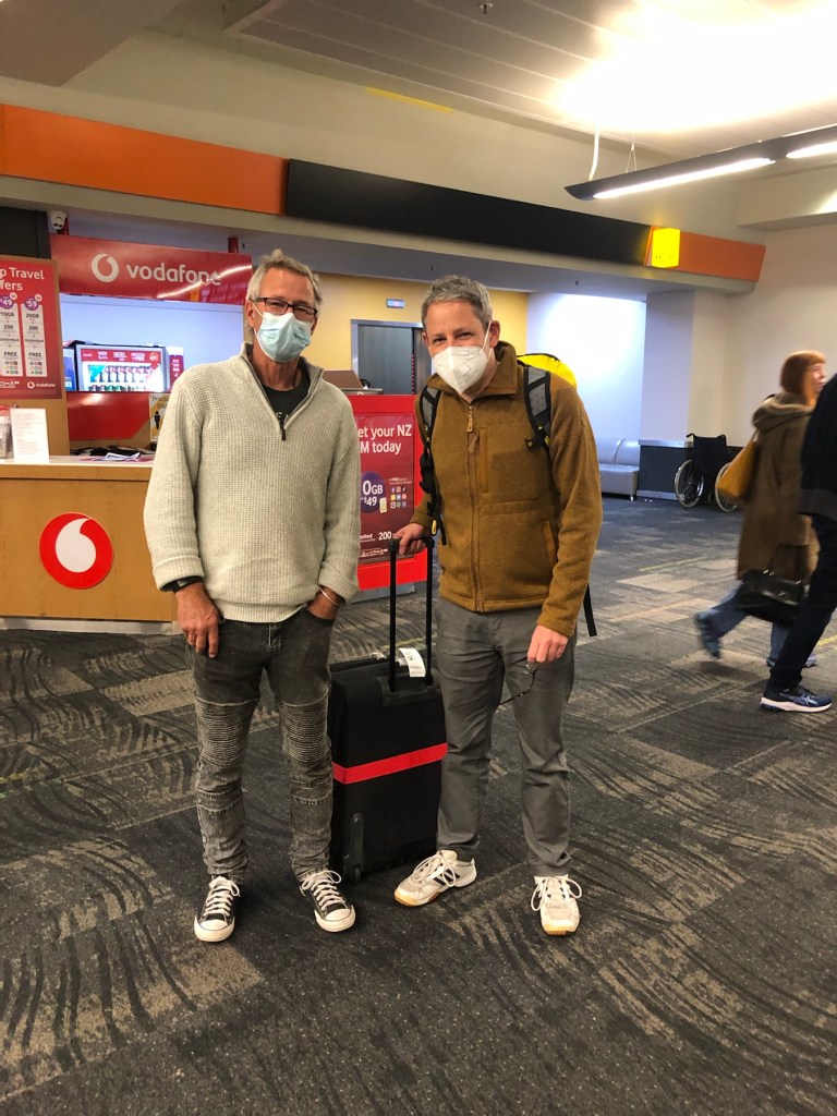 Paddy mit einem etwas erschöpften Tibor kurz nach der Ankunft am Wellingtoner Flughafen.