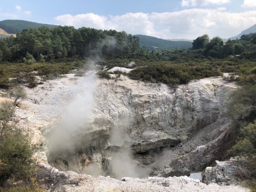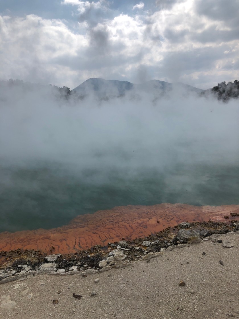 Am Samstag machte ich mich auf den Weg von Taupo nach Rotorua. Mit 55 überwiegend flachen Kilometern war es radtechnisch eine leichte und kurze Etappe mit dem Tagesziel Waiotapu, wo ich mir das „Thermal Wonderland“ anschauen wollte. Und das war wahrlich beeindruckend! Überall rauchte, dampfte und blubberte es, und über der etwas unheimlichen, aber schönen Landschaft waberte starker Schwefelgeruch – so ein bisschen Vorhof zur Hölle… 😊. Die Seen dampften und schillerten in krassen Farben – es war echt der Hammer!