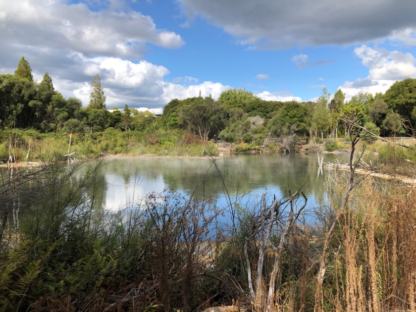Das Maori Village von der Ferne, im Vordergrund kochend heißer See.