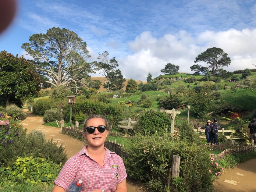 Unser Guide Bethany und der erste Blick auf Hobbiton.