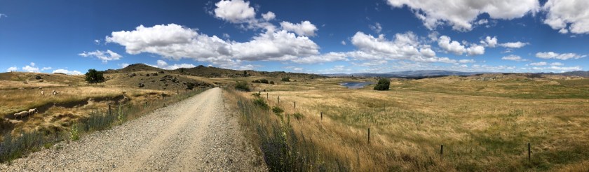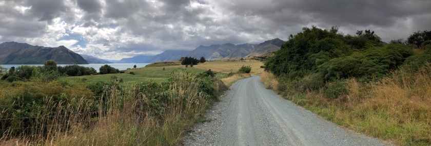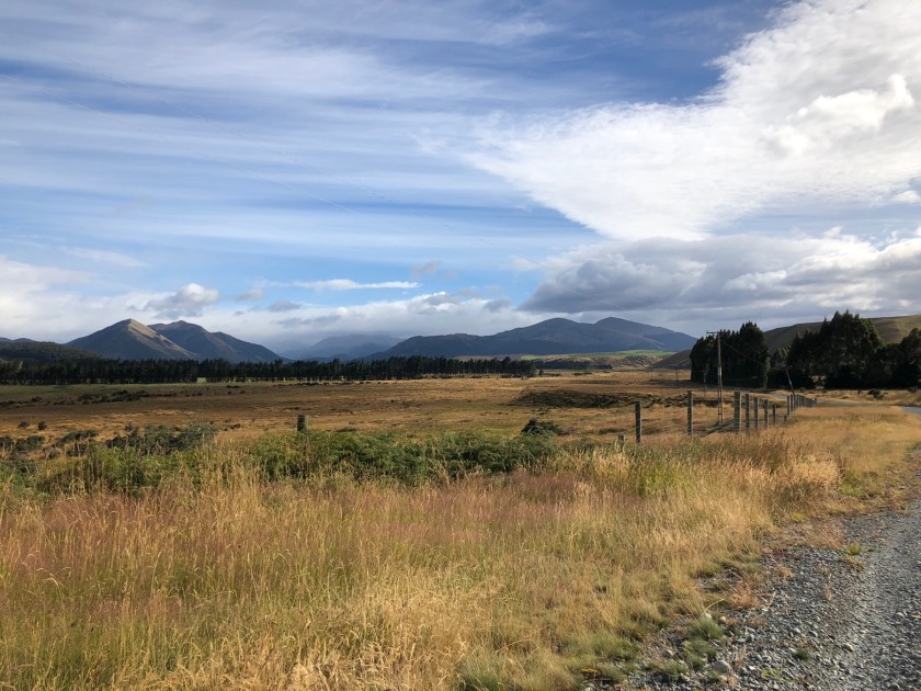 Nach dem total verregneten und stürmischen Samstag hatte sich das Wetter am Sonntag ein klein wenig gebessert, zumindest am Morgen – es war zwar immer noch sehr windig und kühl bei 10 Grad, aber wenigstens hatte es aufgehört zu regnen. Ich machte mich also von Te Anau auf den Weg nach Queenstown, heutiges Ziel waren die Mavora Lakes. Die ersten 30km flutschte es nur so dank des kräftigen Rückenwindes, und so bog ich schon nach 1,5 Stunden vom State Highway auf die Schotterstraße zu den Lakes ab, die Teil des Around The Mountains Cycling Trails war. Nun kam der Wind von der Seite, war aber noch zu ertragen. Dafür hatte ich keinen Verkehr mehr, und die Landschaft um mich herum war sehenswert: