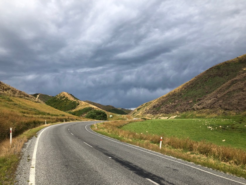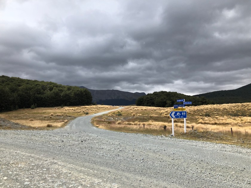 Doch dann wurde es richtig stürmisch, und natürlich änderte sich die Windrichtung, so dass ich Gegenwind hatte, zum Teil so heftige Böen, dass ich stehen bleiben und mich mit meinem ganzen Gewicht dagegen stemmen musste, um nicht rückwärts zu fahren! Was für ein Spaß – nicht!!! Und so war ich heilfroh, als ich nach weiteren 37km (für die ich 3,5 Stunden gebraucht hatte!!) endlich an der Abzweigung zu den Lakes und dem Campingplatz ankam – auch wenn die dunklen Wolken am Himmel nichts Gutes verhießen…
