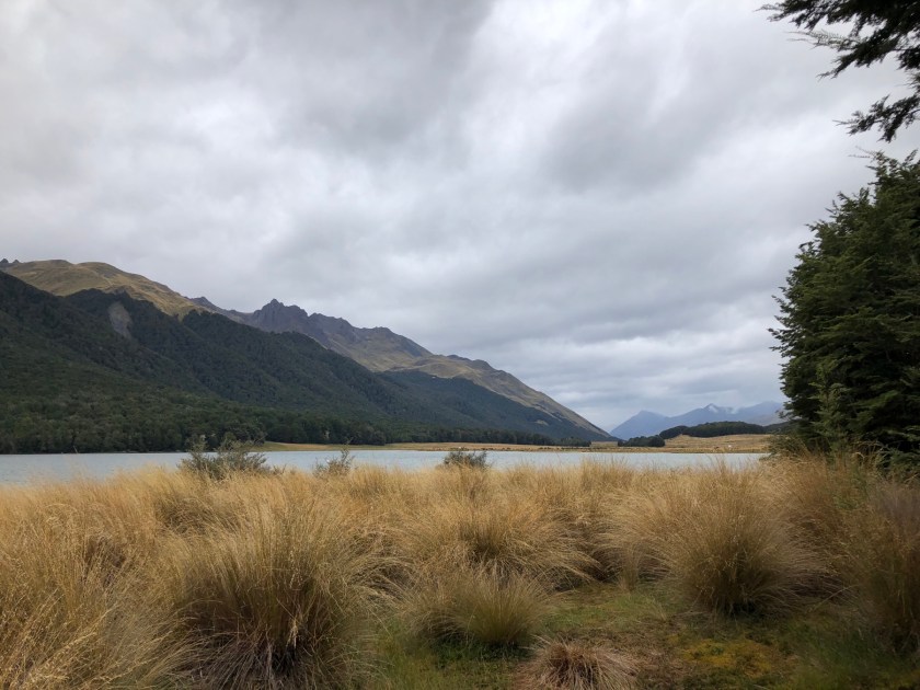 Am Montag morgen packte ich bei Nieselregen mein Zeug und das mal wieder tropfnasse Zelt und radelte los Richtung Walter Peak Station. Das Wetter war weiterhin ungemütlich windig, nass und kühl, aber wenigstens hatte ich nicht mehr so krassen Gegenwind. Und die Landschaft war atemberaubend – wild, menschenleer, echt am A… der Welt! Nur Kühe gab es jede Menge, und die standen (oder 💩) auch gern mal auf der (die) Straße, aber wenn ich näher kam, machten sie brav Platz. Hier ein paar Eindrücke: