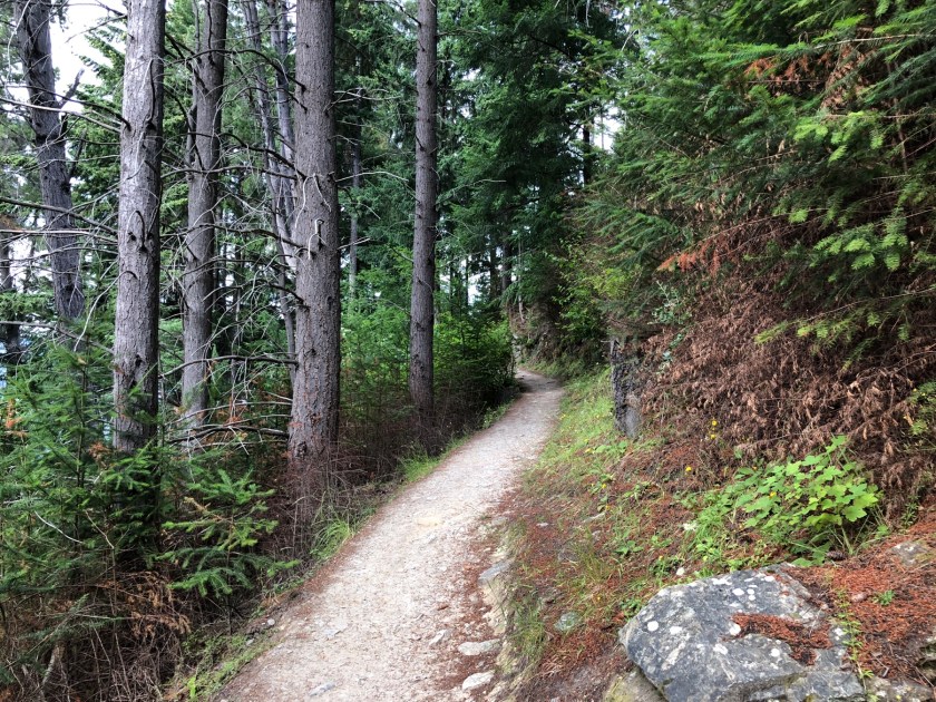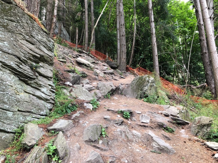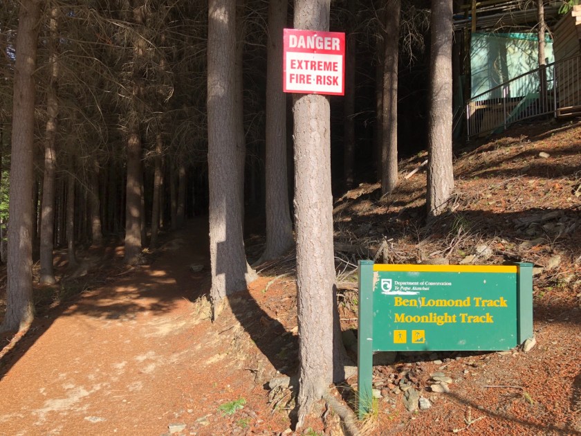 Am Dienstag wollte ich den hiesigen Hausberg Ben Lomond (1748m) besteigen. Angeblich sei das eine sehr anstrengende, schwierige Tour mit 1400 Höhenmetern – mir kam sie nicht so schwer vor, lediglich die letzten 200hm waren wirklich steil. Ich startete also bei heute endlich wieder wunderschönem, warmem Wetter mit bester Laune um 7.30 Uhr am Morgen. Zuerst ging es auf dem Tiki Trail zur Bergstation der Gondola, die zum Glück erst um 9.00 Uhr öffnete, so waren noch keine Leute unterwegs. Der Weg windet sich wunderschön durch den Wald, auch mal über Fels: