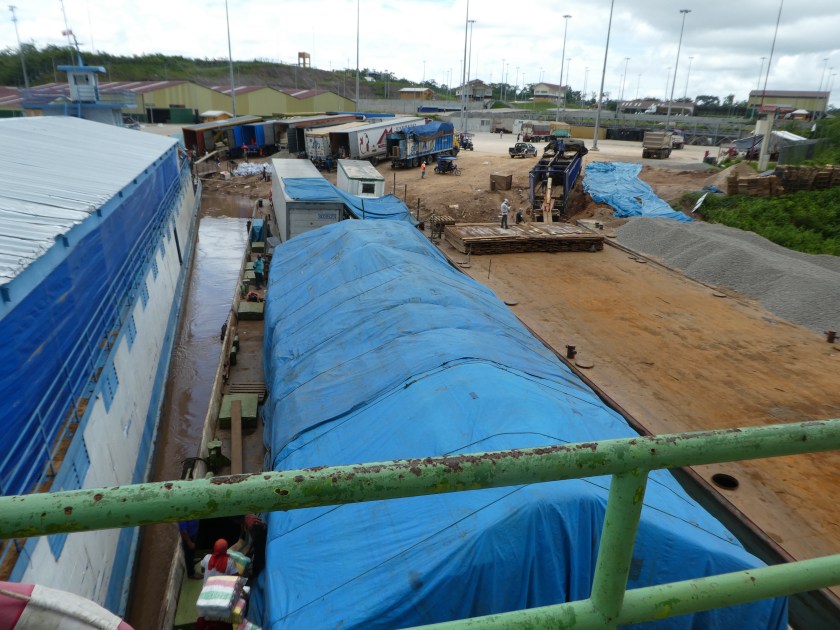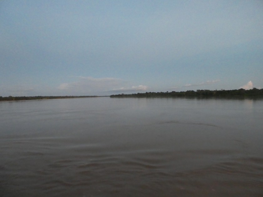 Man hatte mir gesagt, dass das Schiff um 15.00 Uhr fahren würde, aber Zeit ist hier relativ. Um 18.00 Uhr war klar, dass es heute gar nicht mehr fahren würde, woraufhin einige Leute das Schiff wieder verließen, die meisten blieben aber, ich auch. Das Auf-dem-Schiff-Schlafen war auch gar kein Problem, aber Essen bekamen wir nicht, das würde es erst auf der Fahrt für uns geben. Rund um den Hafen gab es gar nichts, und der Ort war 7km entfernt. Ich war froh, dass ich vorher nicht nur einen 5-Liter-Kanister Wasser, sondern auch Obst und Kekse besorgt hatte, so hatte ich wenigsten ein Abendessen, das Pärchen aus Chile und Tchechien hatte nichts dabei (ich teilte meine Kekse mit ihnen). So schlief ich also meine erste Nacht in der Hängematte noch im Hafen – und stellte fest, sonderlich bequem ist das nicht, v.a. wenn man normalerweise auf dem Bauch schläft… Vorher hatte ich überlegt, was ich mit meinen Wertsachen machen sollte. In sämtlichen Reiseblogs wird empfohlen, mit dem Rucksack in der Hängematte zu schlafen, aber es war ja eh schon relativ unbequem. So packte ich lediglich meinen Pass, meine Kreditkarten und mein Geld in meinen Brustbeutel, den ich die ganze Reise um den Hals trug. Alles andere ließ ich, häufig „unbewacht“, im Rucksack und dachte mir, wir sind so wenige Passagiere, und die Familie war die ganze Zeit da, da würde schon nichts weg kommen. Vielleicht war ich da ein bisschen sehr sorglos, aber Tatsache ist, dass tatsächlich nichts weg kam.