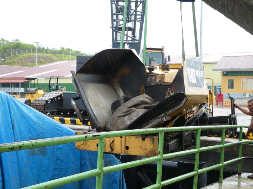 Ziemlich moderner Ladekran im neuen Hafen, links Nebendarsteller die Maschinen, die dann aufs Schiff verladen wurden.