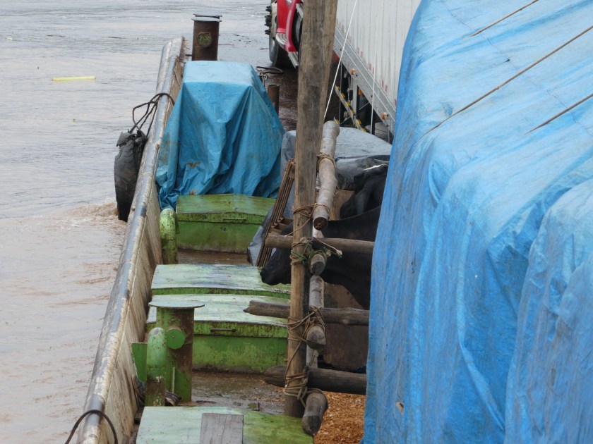 Unser Schiff, schon fast voll beladen, im Hafen. Unter der Plane war alles Mögliche an Baumaterial (v.a. Säcke mit Sand usw.), die beiden LKWs und bestimmt 30 Kühe.