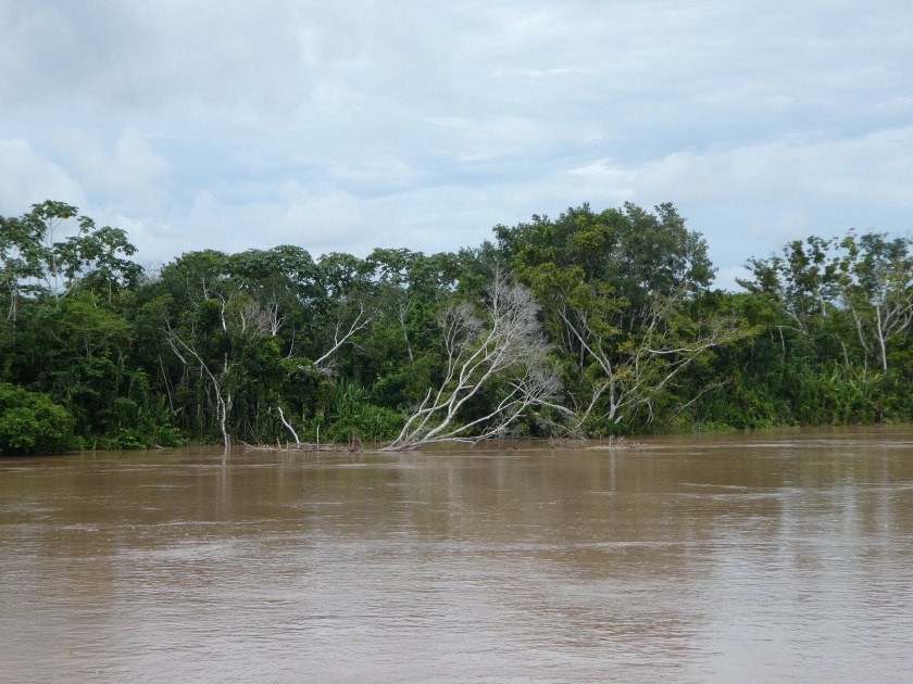 Mittags gab es dann das erste Essen aus der Bordküche. Hierfür muss jeder einen eigenen Teller bzw. Tupperdose und Besteck dabei haben, man stellt sich brav in einer Reihe an und bekommt, wenn man dran ist, jede Menge Reis, eine Kochbanane, viel zu wenig Soße und ein kleines Stückchen Huhn aufgeladen, also sehr einfaches Essen, aber mehr als reichlich. Ich konnte nicht alles essen und hab den trockenen Reis an meinen Hängemattennachbarn weitergereicht, der sich erfreut drüber her machte. Den größten Teil der Zeit auf dem Boot verbrachte ich mit Auf-das-Wasser-und-die Küste-Schauen bei trockenem Wetter und Lesen bei Regen – und davon hatten wir leider reichlich! Dieses sehr eintönige, aber superentspannte Bordleben wurde am Mittag des ersten Tages kurz durch einen Unfall belebt: das Boot wurde von der Strömung in das Ufer getrieben und fällte 2 Bäume: