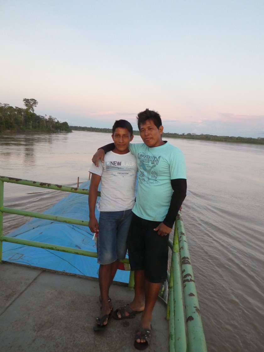 Ich hatte einen Platz direkt neben der Küche auf dem ersten Deck gefunden, zusammen mit einer 6-Köpfigen Familie, einem jungen Pärchen und einem Typen, der geschäftlich nach Iquitos musste. Auf dem zweiten Deck waren nochmal vielleicht 10 Passagiere, unter anderem noch drei Ausländer: ein Chilenisch-tschechisches Pärchen und ein Engländer – die einzigen auf dem Boot, die Englisch sprachen. Auf dem dritten Deck residierte der Käpt’n, und man konnte dort einfach sitzen und die Aussicht genießen. Die Toiletten fand ich nach einer Weile im „Erdgeschoss“, ganze zwei an der Zahl (nur eines hatte ein Waschbecken dabei), und sie waren mega-eklig: kein Sitz, superdreckig, ohne Spülung – und einige Benutzer verstanden nicht, warum ein Wassereimer da rum stand und wie er zu benutzen war… und der Gestank war bestialisch. Naja, sehr authentisch… und für drei Tage würde es schon gehen. Ich erspare euch hier Bilder davon… 😖.