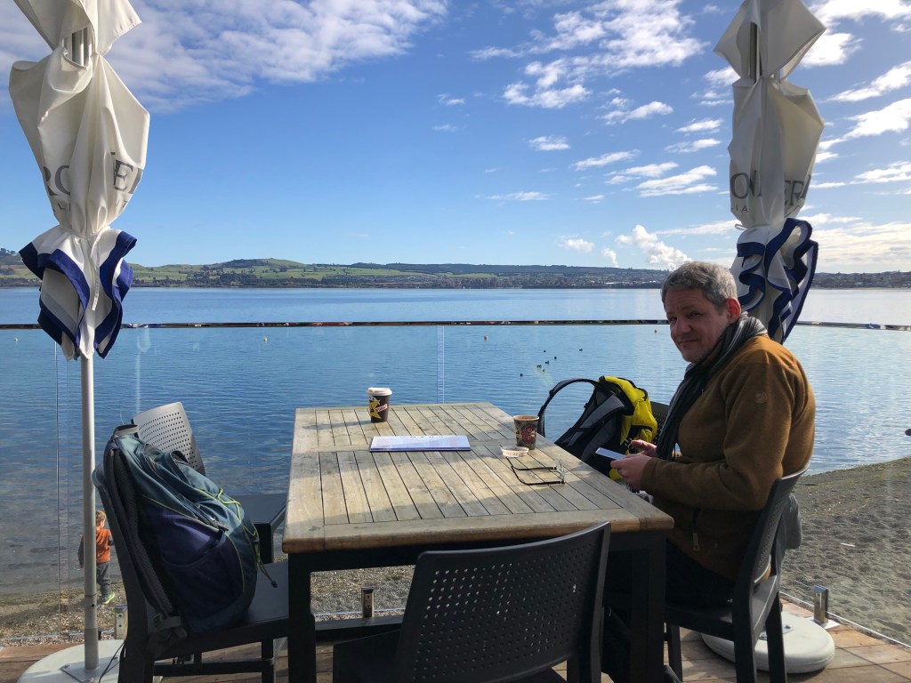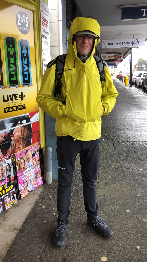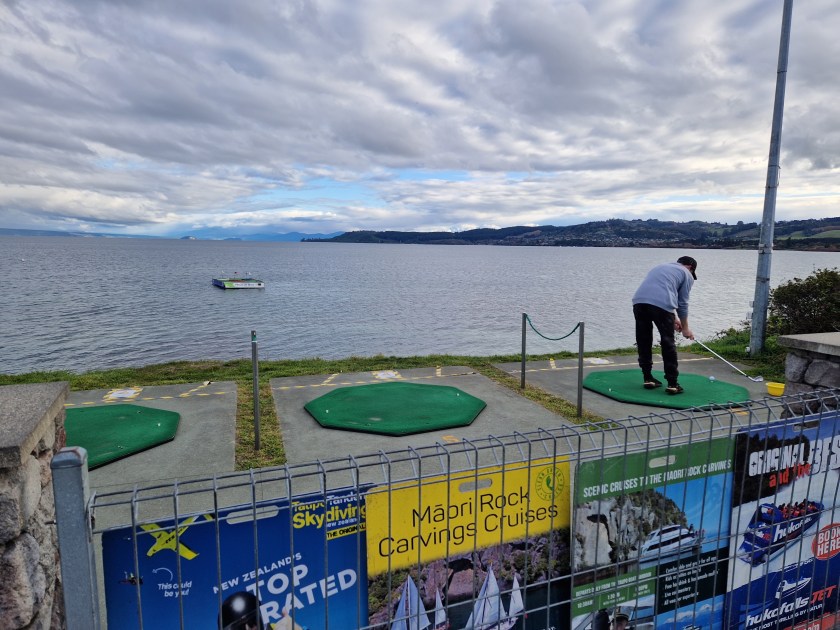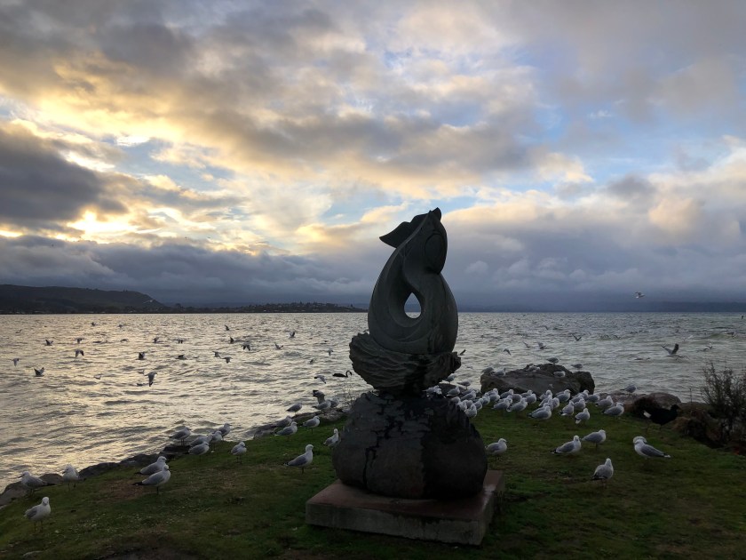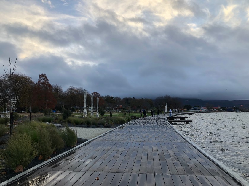 Danach liefen wir vom Polynesian Spa immer am Ufer des Lake Rotorua entlang bis hin zum Ohinemutu Village. Ausgerechnet da überraschte uns dann ein Regenguss, und es gibt natürlich keine Möglichkeit, sich irgendwo unterzustellen… ich muss zugeben, ich war kurzzeitig ein bisschen neidisch auf Tibor’s professionelle Ausrüstung:
