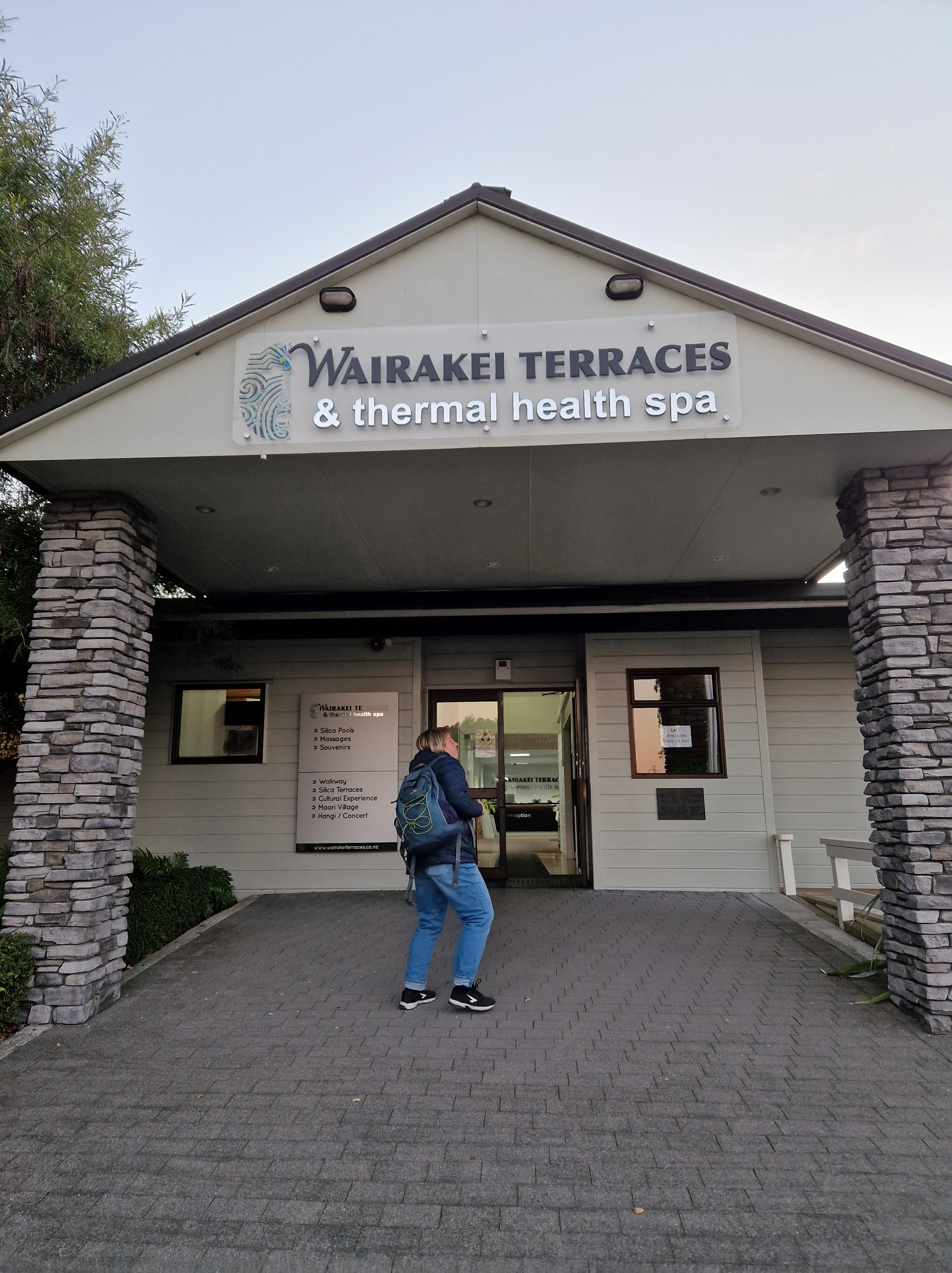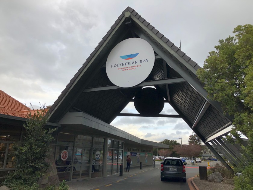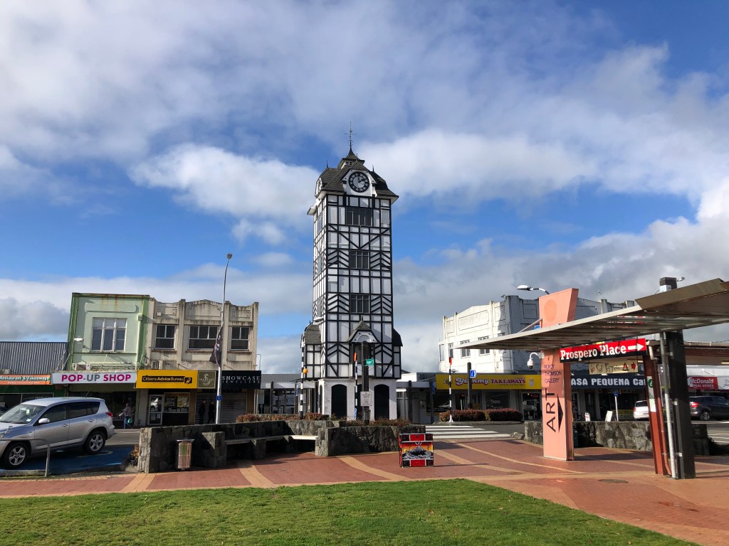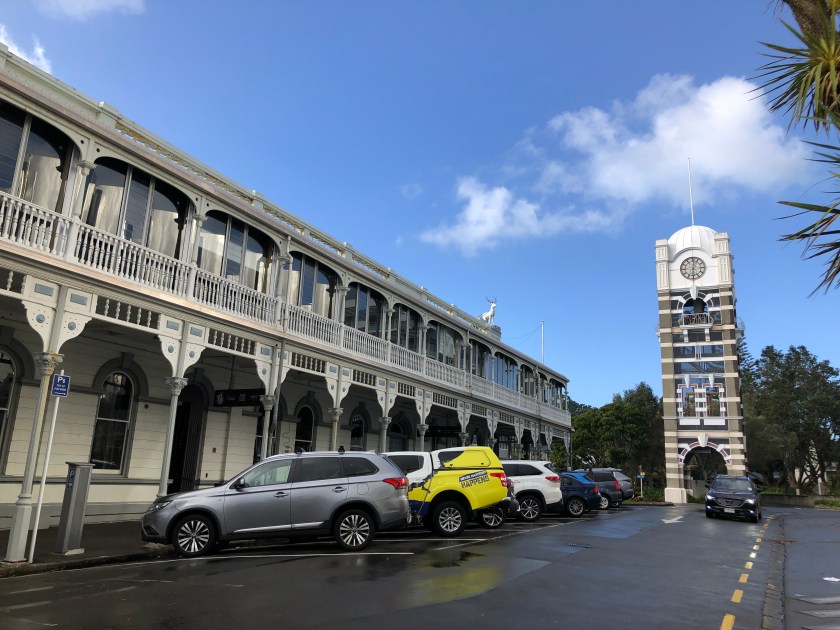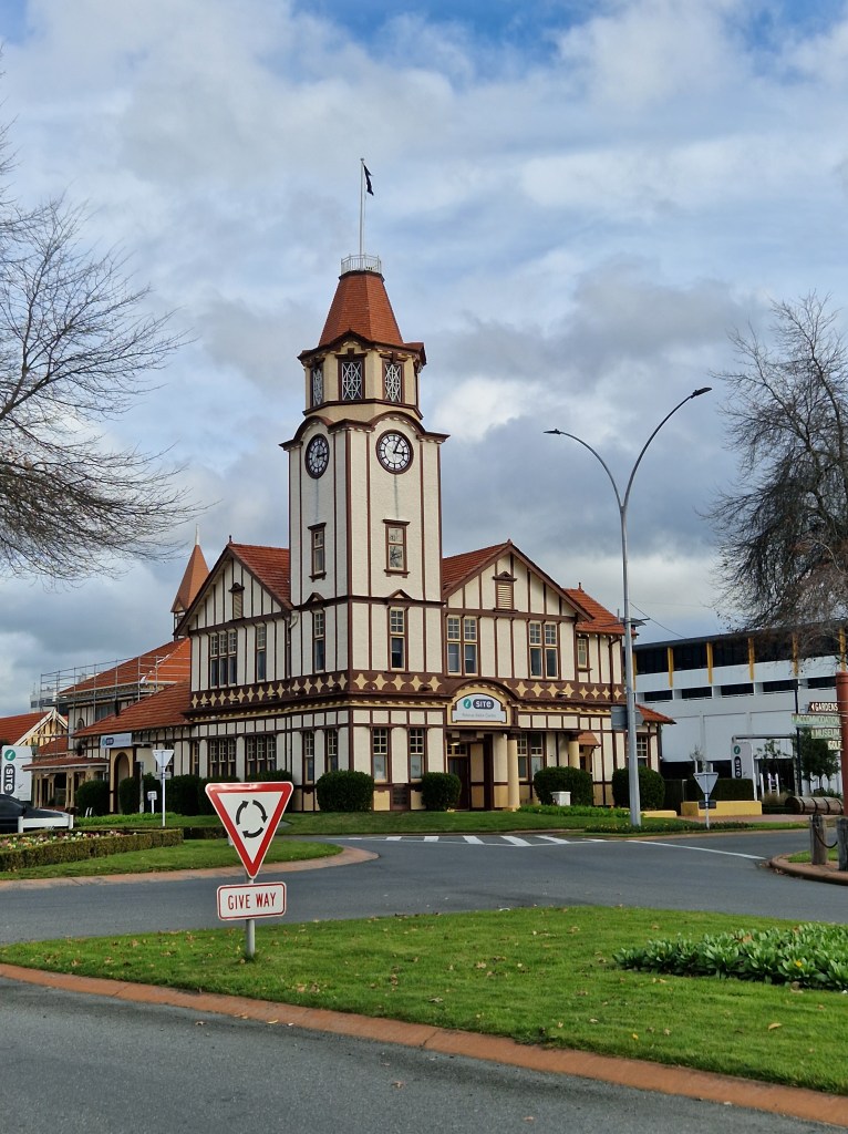 Wieder zurück in Rotorua begaben wir uns auf Stadtbesichtigungstour, diesmal bei Tageslicht. Wir hatten richtiges Aprilwetter mit fast allem, was das Wetter so zu bieten hat: Sonnenschein, Wolken, Regenguss, Sonne, Wind, … und alles in 5-minütigem Wechsel. Tibor war für alle Wetter gerüstet, ich hingegen wurde zwischendurch ordentlich nass. Aber Rotorua ist auch im Regen schön. Ich liebe dieses Städtchen, in dem es überall dampft und nach Schwefel riecht! Viele Bewohner machen sich die Vulkanaktivität zu nutze und heizen ihre Häuser oder ihr Wasser mit dem natürlichen Dampf. Manche kochen sogar im heißen Wasser draußen. Auch die Architektur ist sehenswert, allen voran das Rotorua Museum (das leider geschlossen war), das marokkanisch anmutende Blue Bath und die Tourist Information: