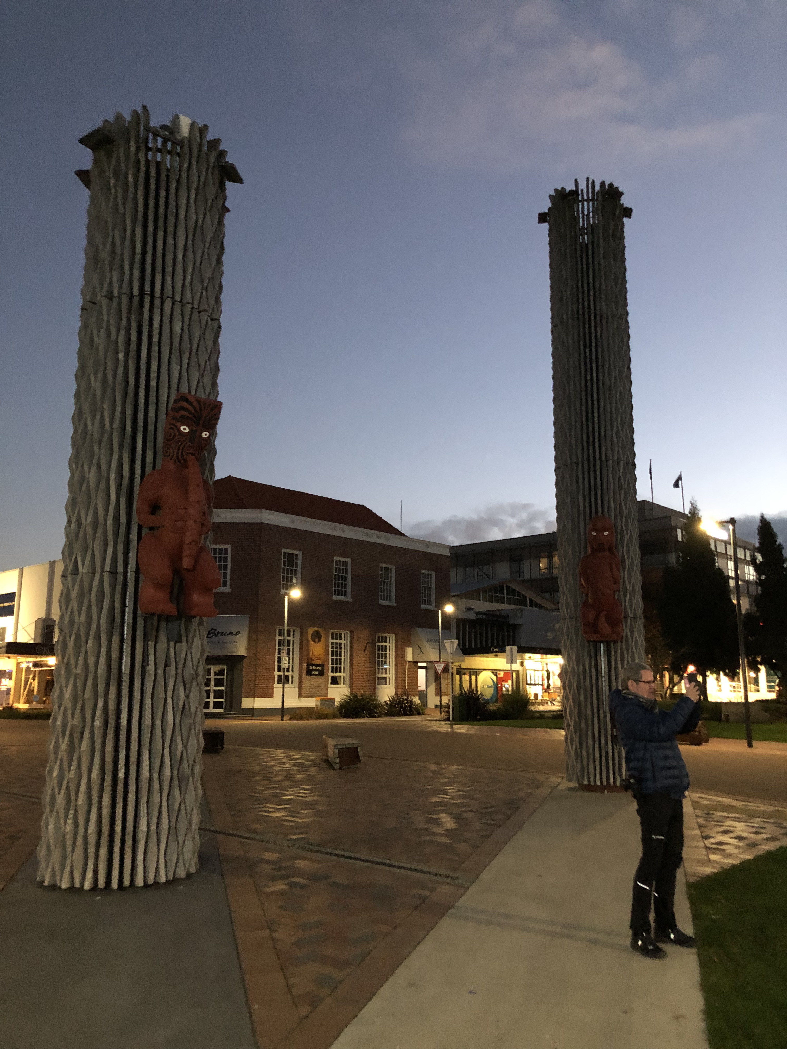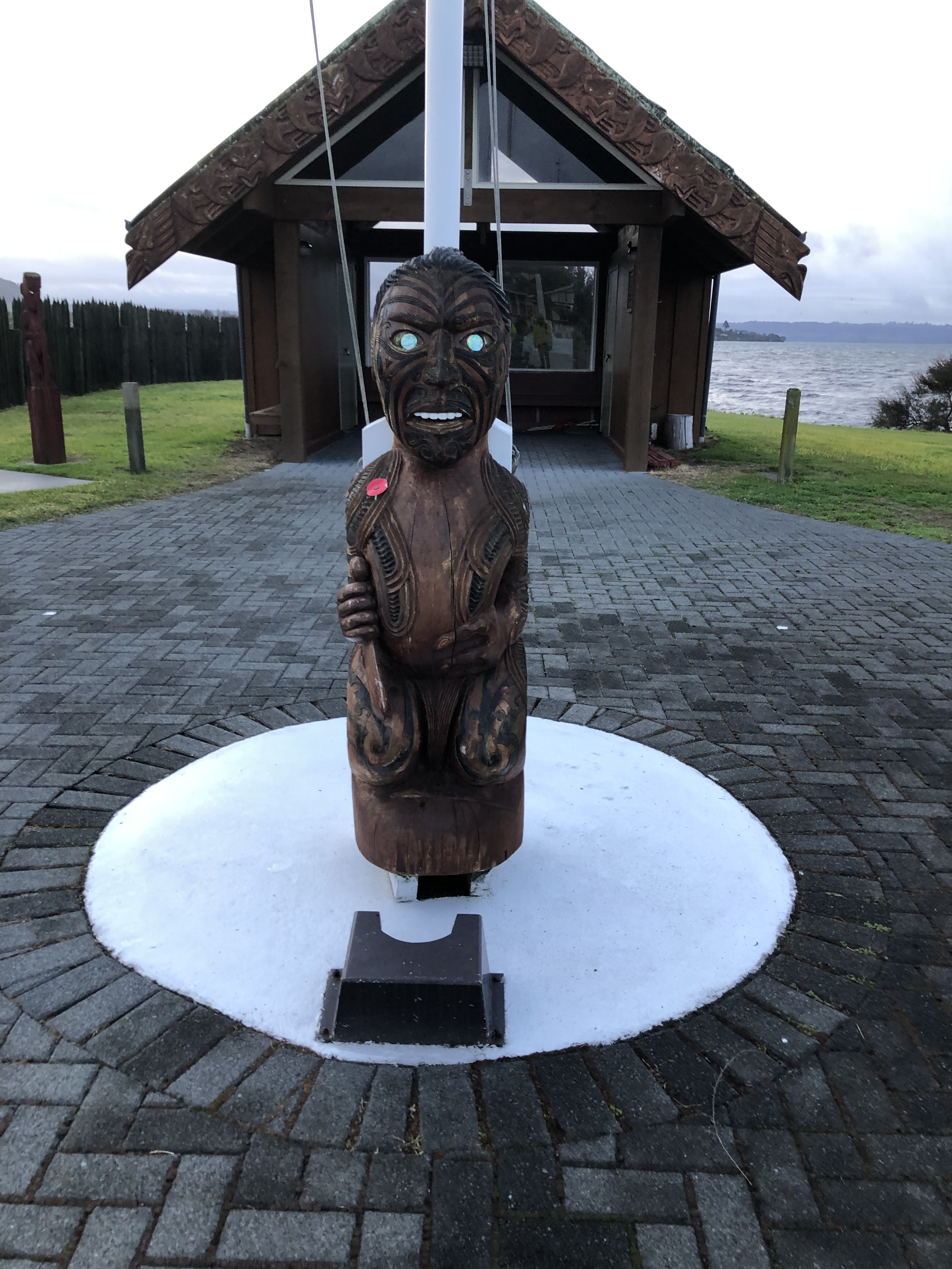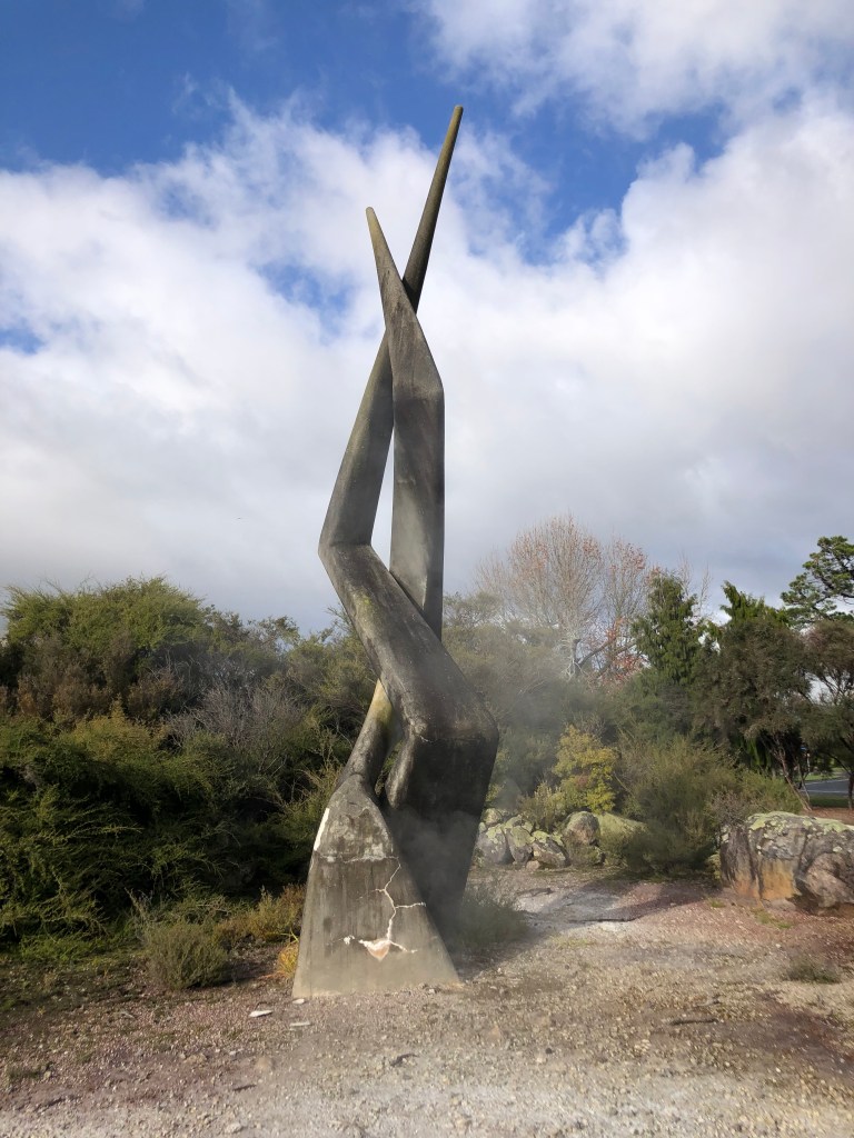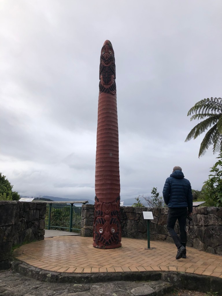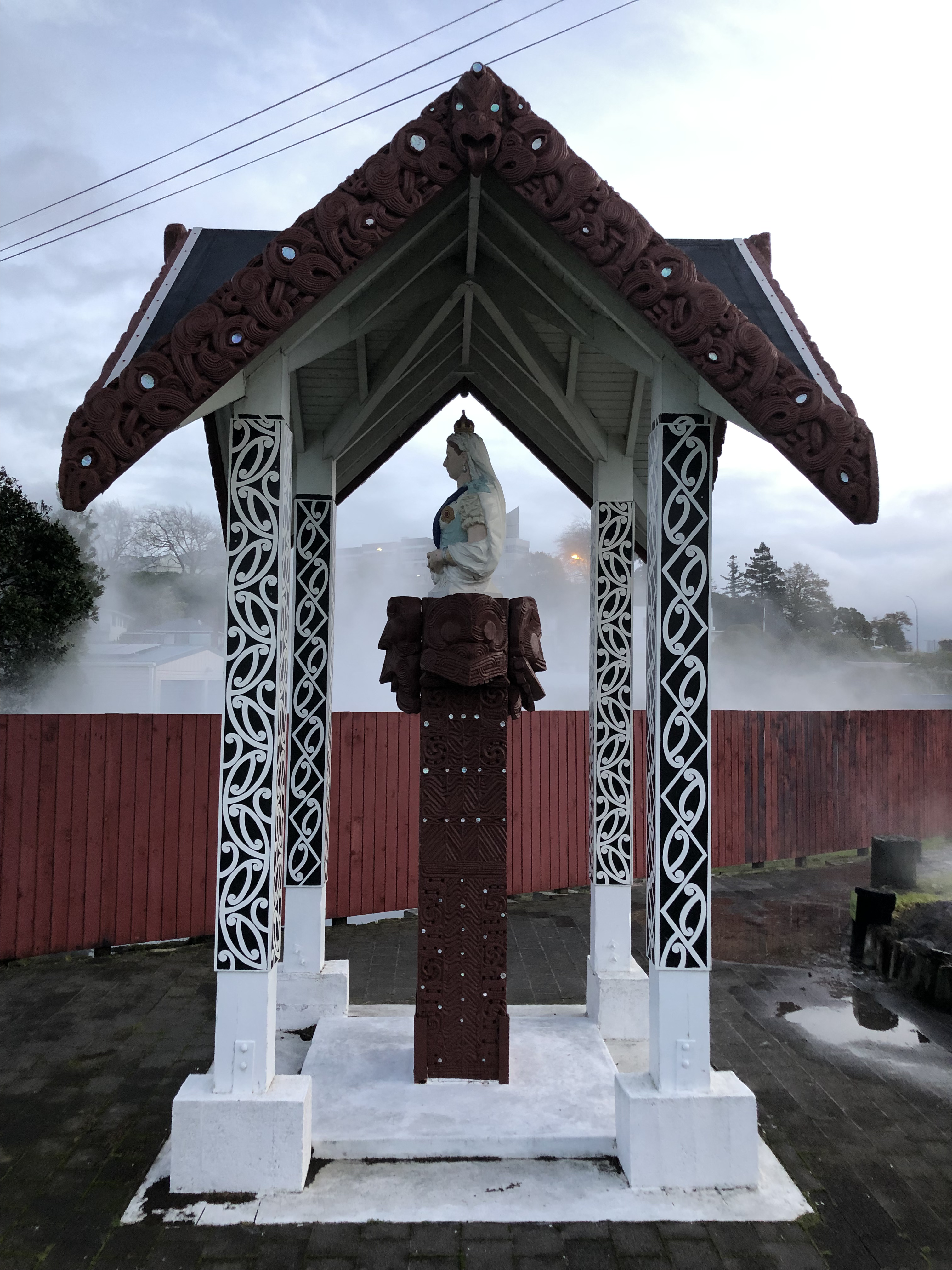 Es dämmerte schon (obwohl das bei dem Wetter schwer zu sagen war, weil es eh ziemlich dunkel war), als wir unser letztes Ziel für heute erreichten, das Ohinemutu Village. Hier gibt es eine Kirche, ein Marae (Maori meeting house), einen Friedhof und jede Menge Skulpturen, Dampf (sogar aus der Straße) und Schwefel zu sehen bzw. zu riechen: