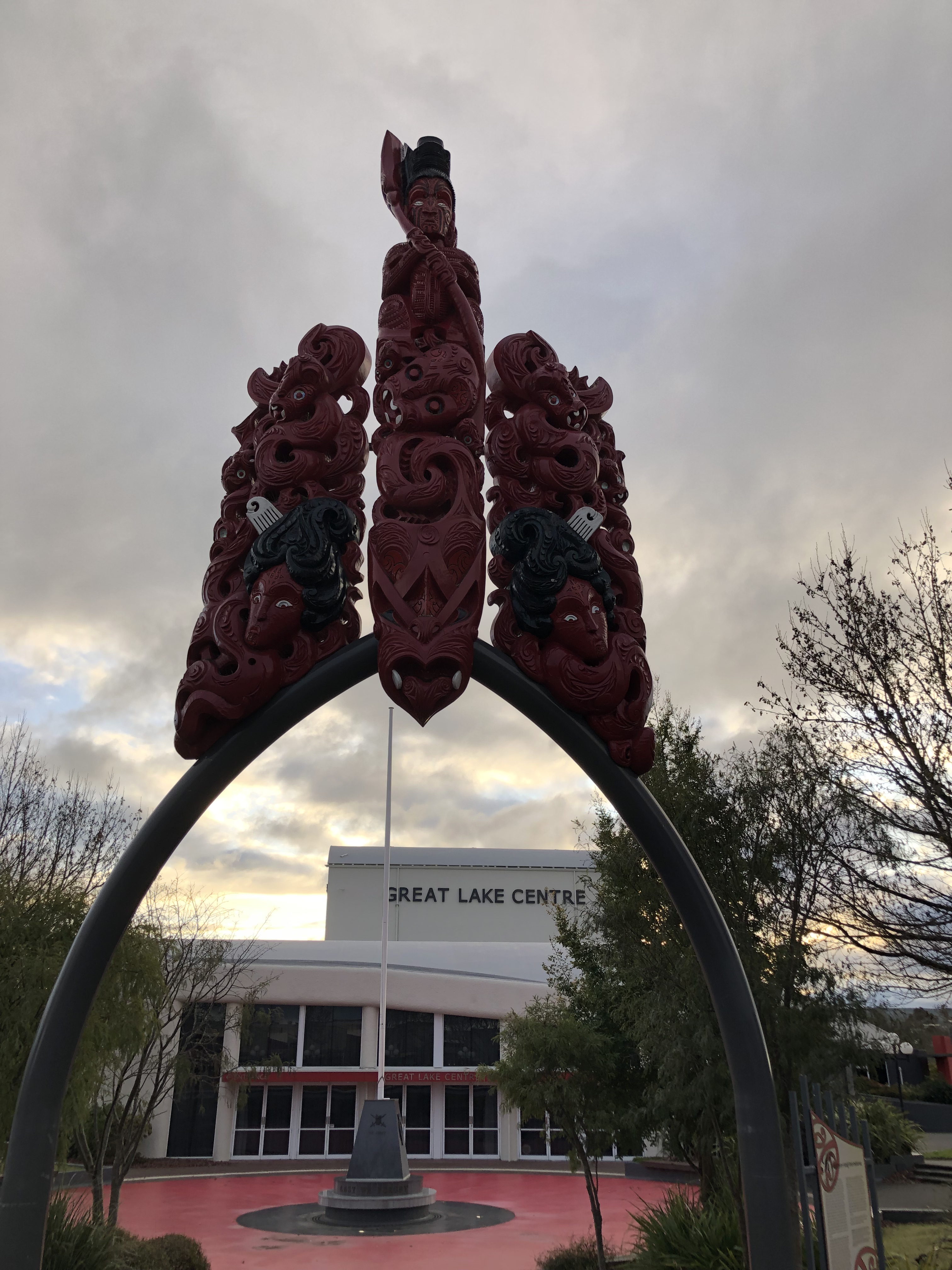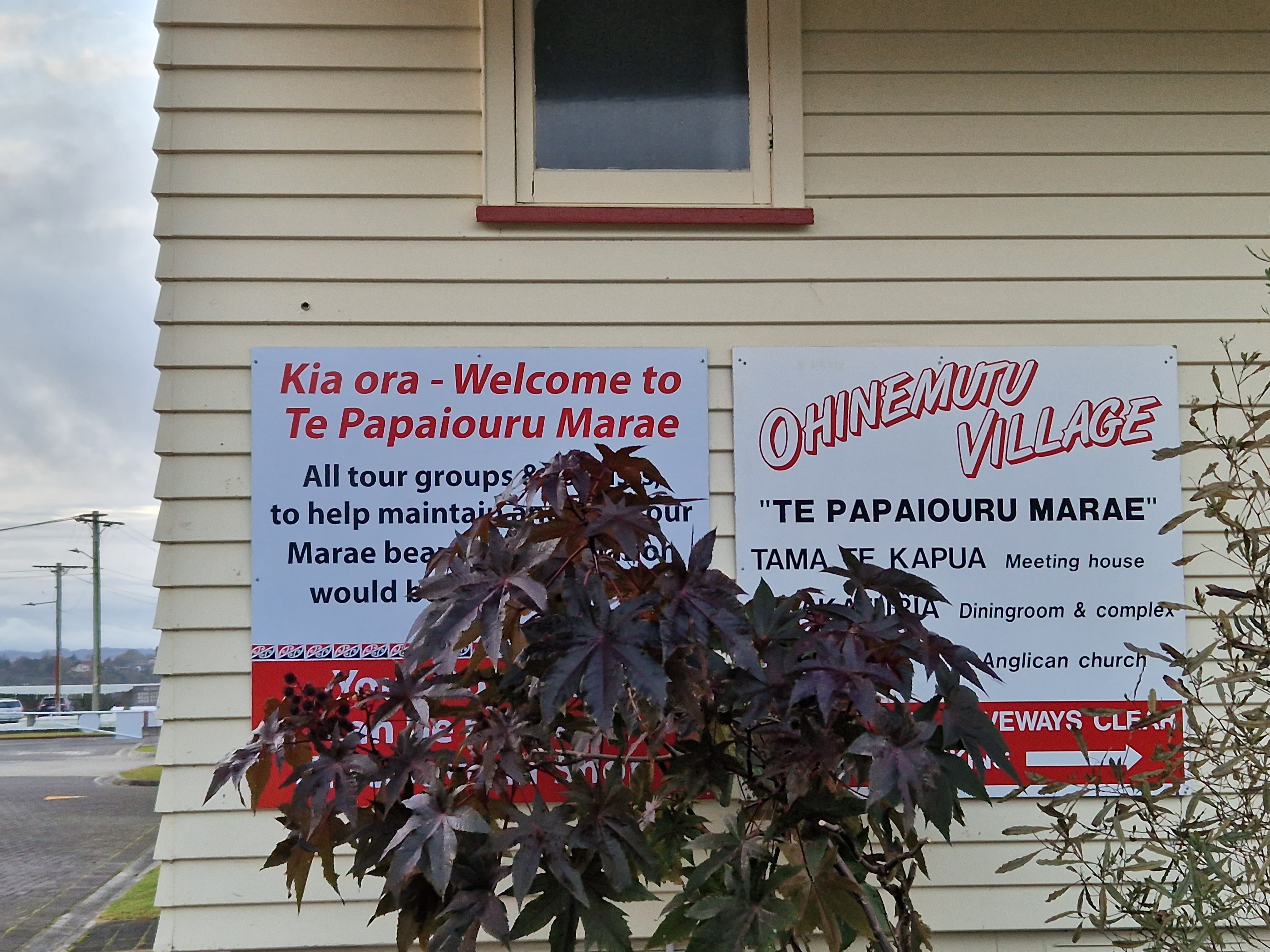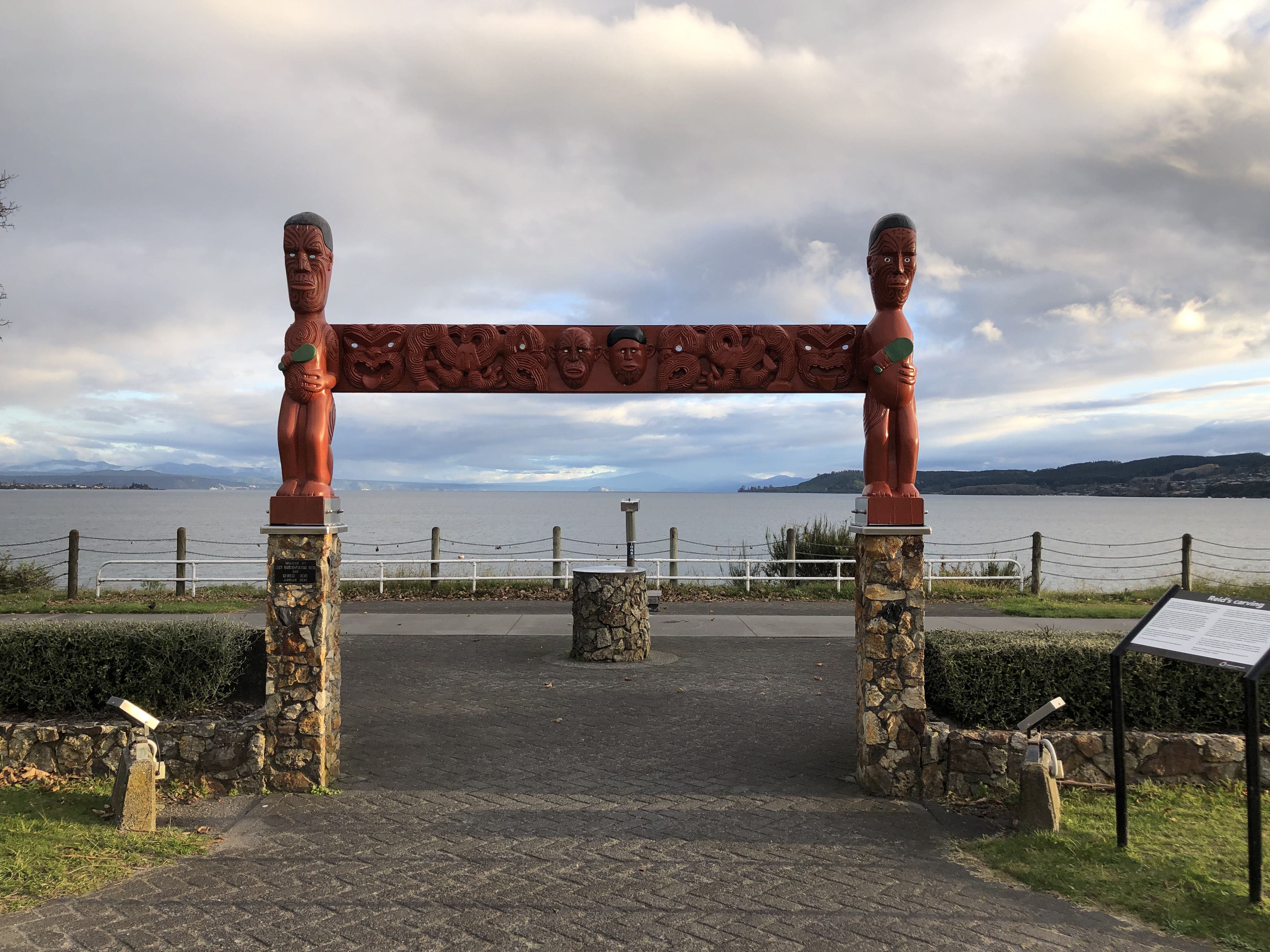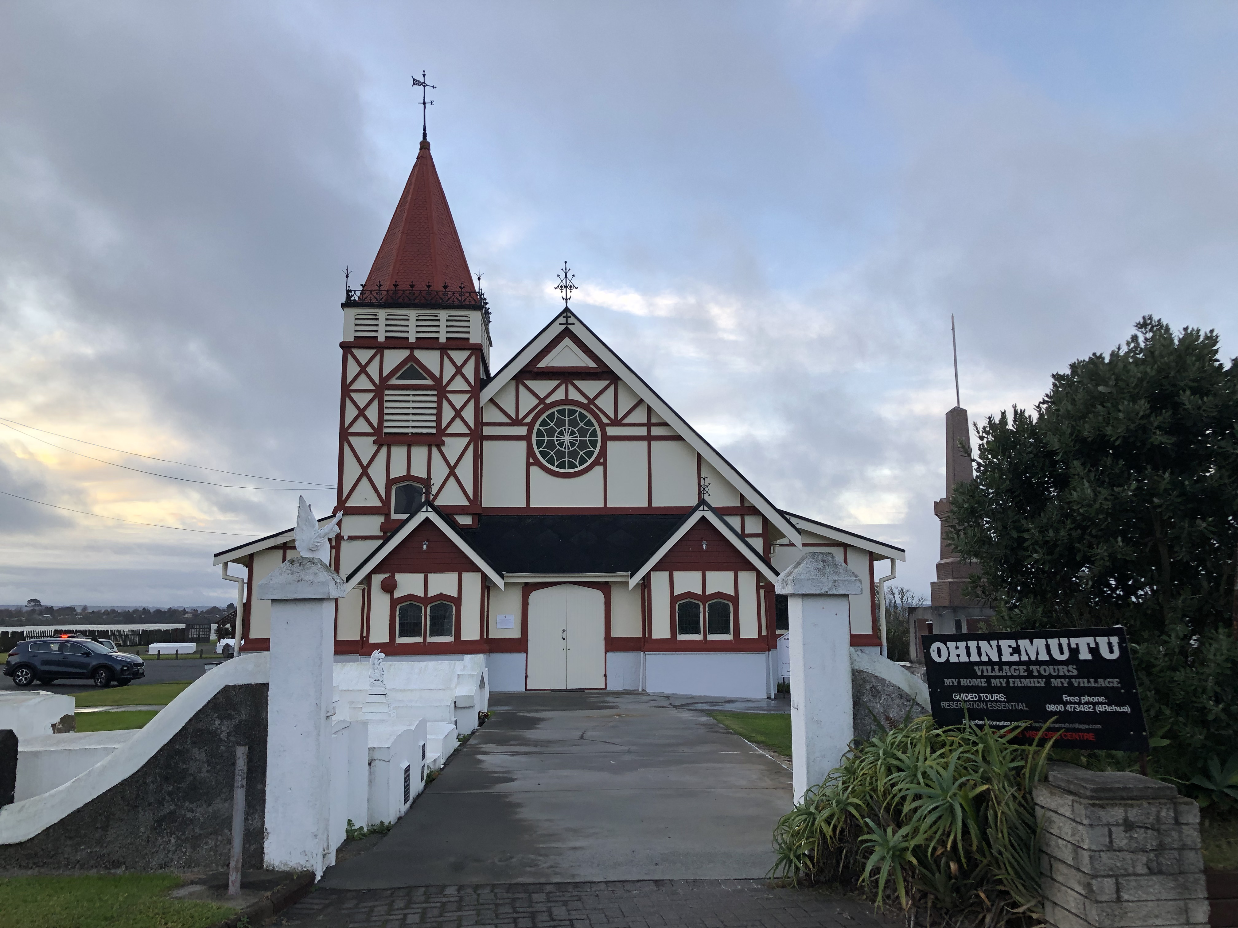 Es dämmerte schon (obwohl das bei dem Wetter schwer zu sagen war, weil es eh ziemlich dunkel war), als wir unser letztes Ziel für heute erreichten, das Ohinemutu Village. Hier gibt es eine Kirche, ein Marae (Maori meeting house), einen Friedhof und jede Menge Skulpturen, Dampf (sogar aus der Straße) und Schwefel zu sehen bzw. zu riechen: