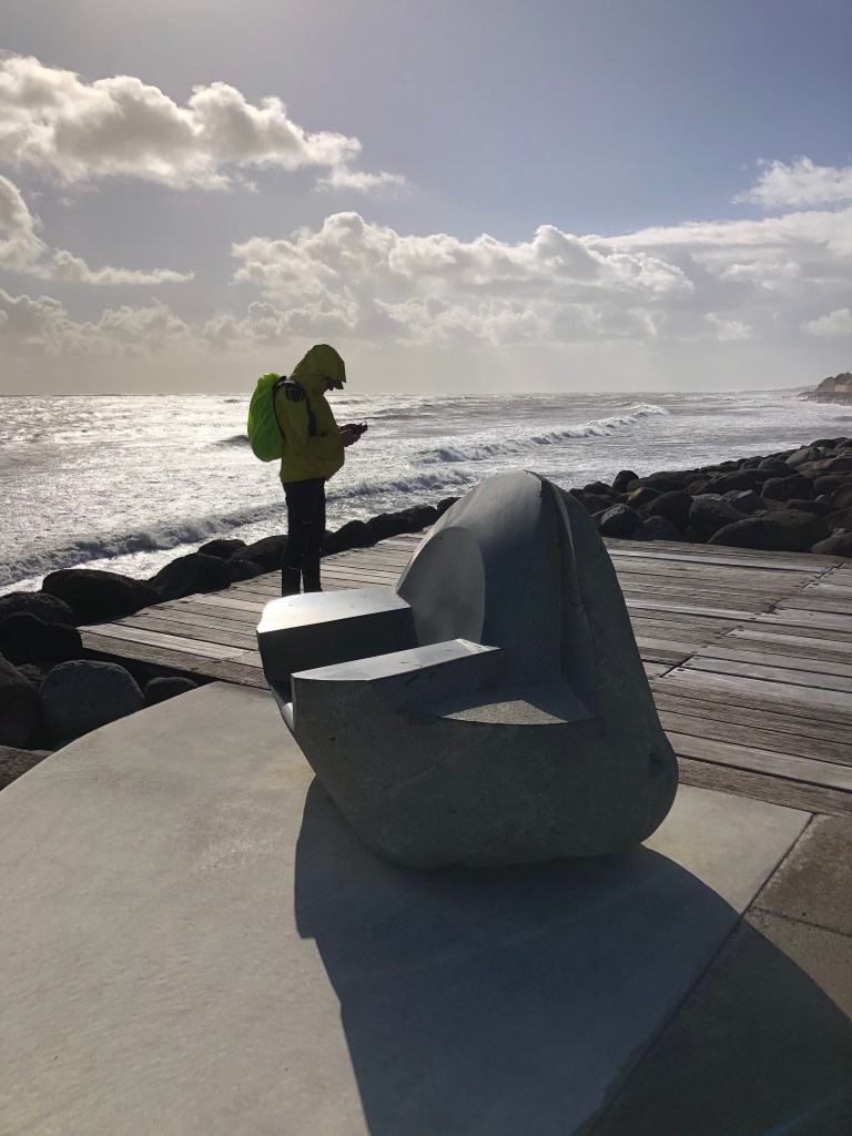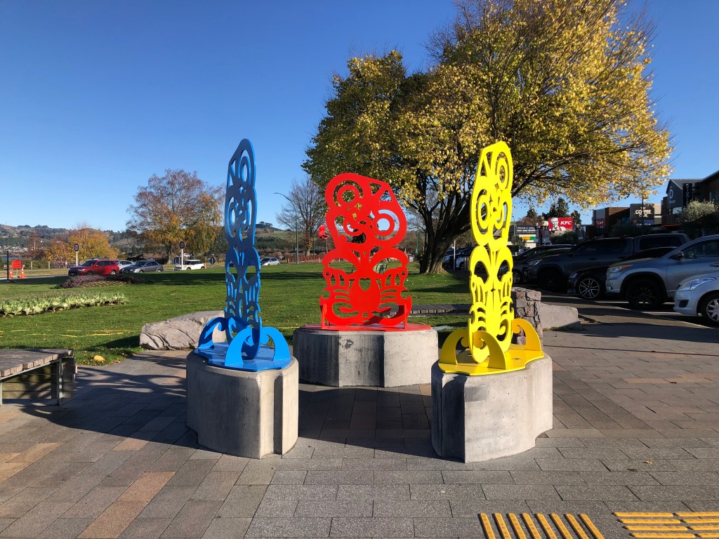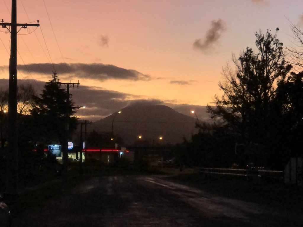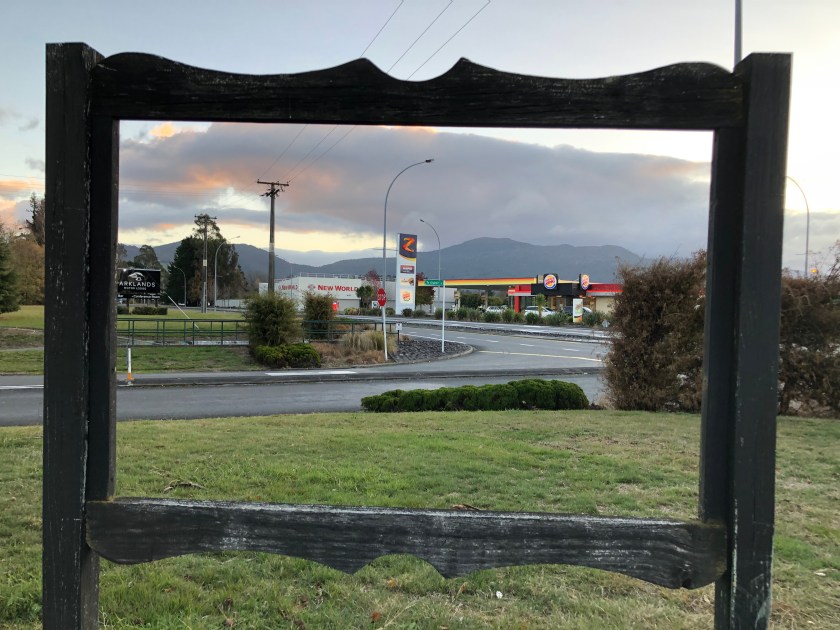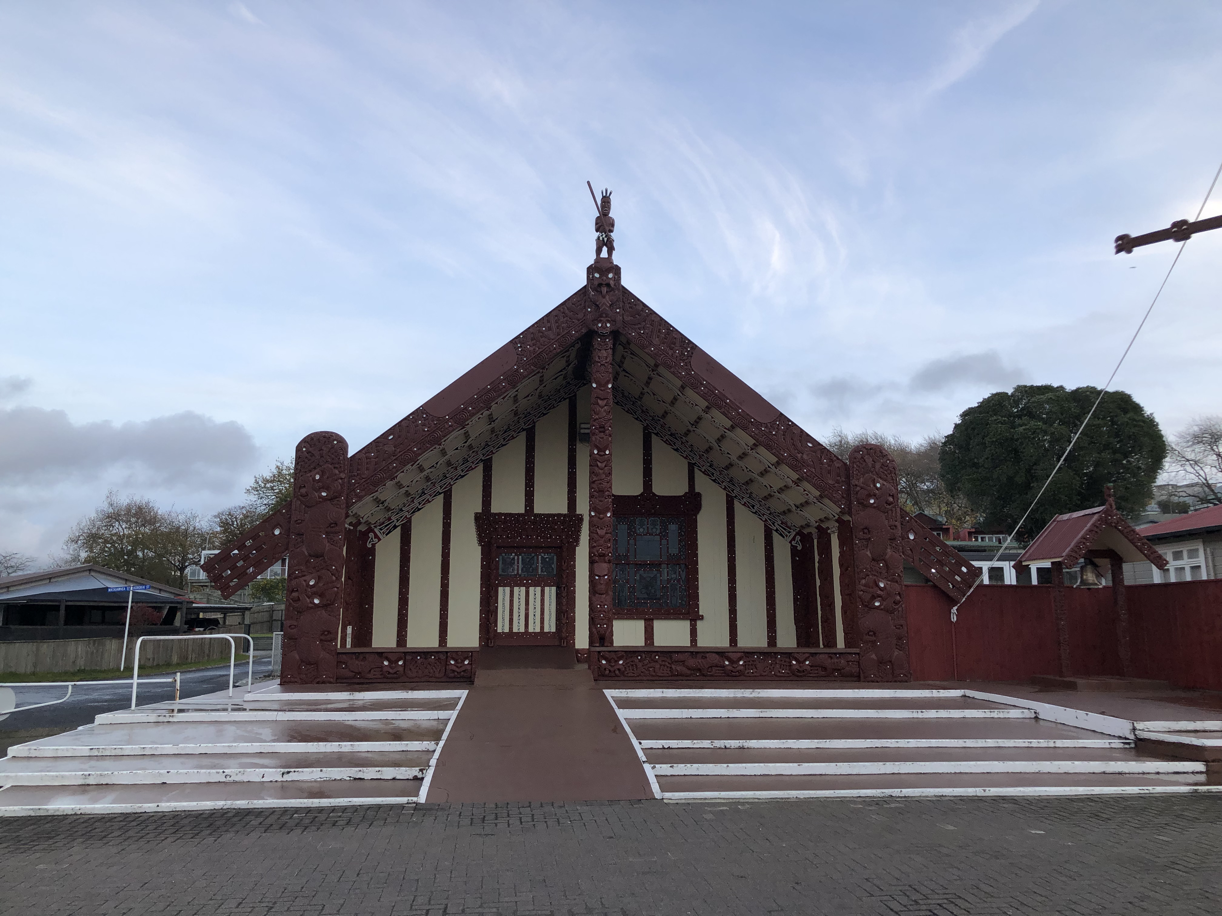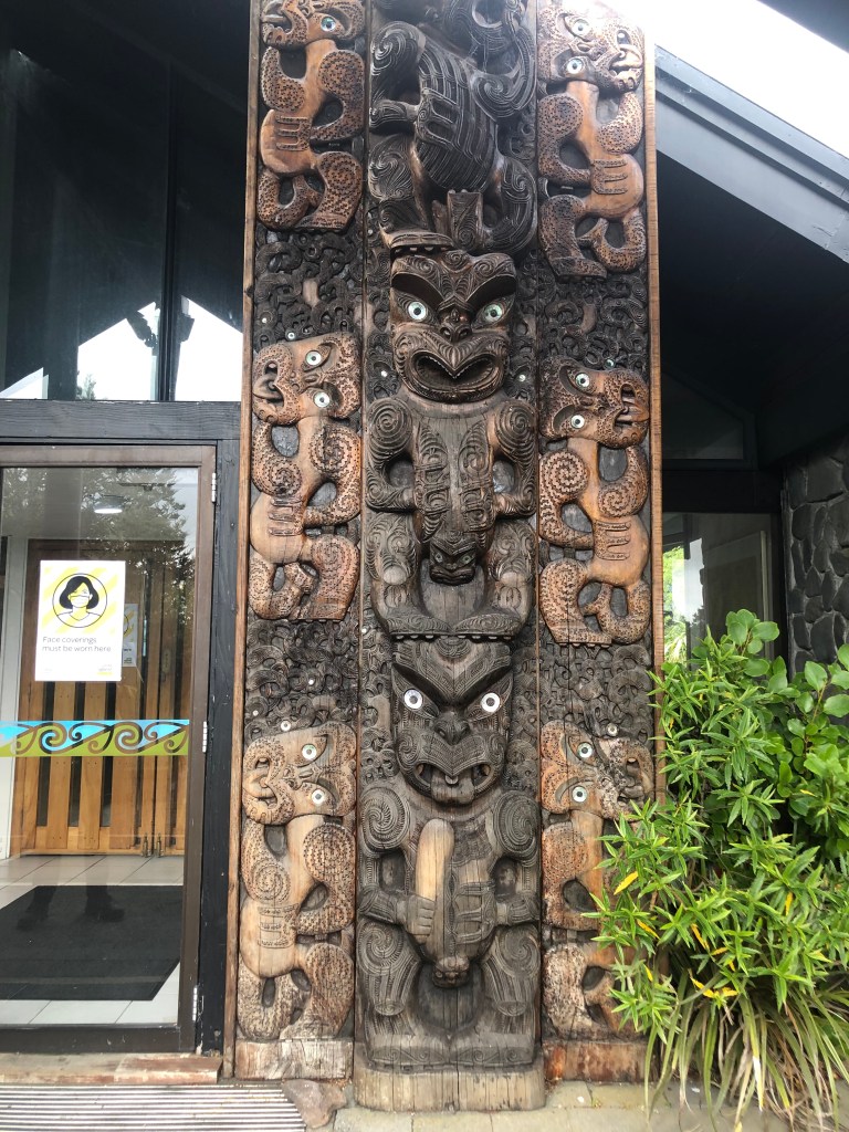 Es dämmerte schon (obwohl das bei dem Wetter schwer zu sagen war, weil es eh ziemlich dunkel war), als wir unser letztes Ziel für heute erreichten, das Ohinemutu Village. Hier gibt es eine Kirche, ein Marae (Maori meeting house), einen Friedhof und jede Menge Skulpturen, Dampf (sogar aus der Straße) und Schwefel zu sehen bzw. zu riechen: