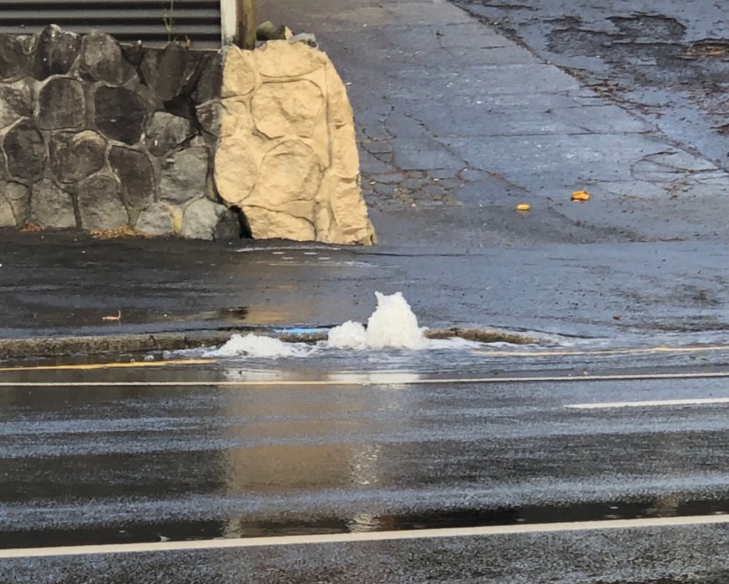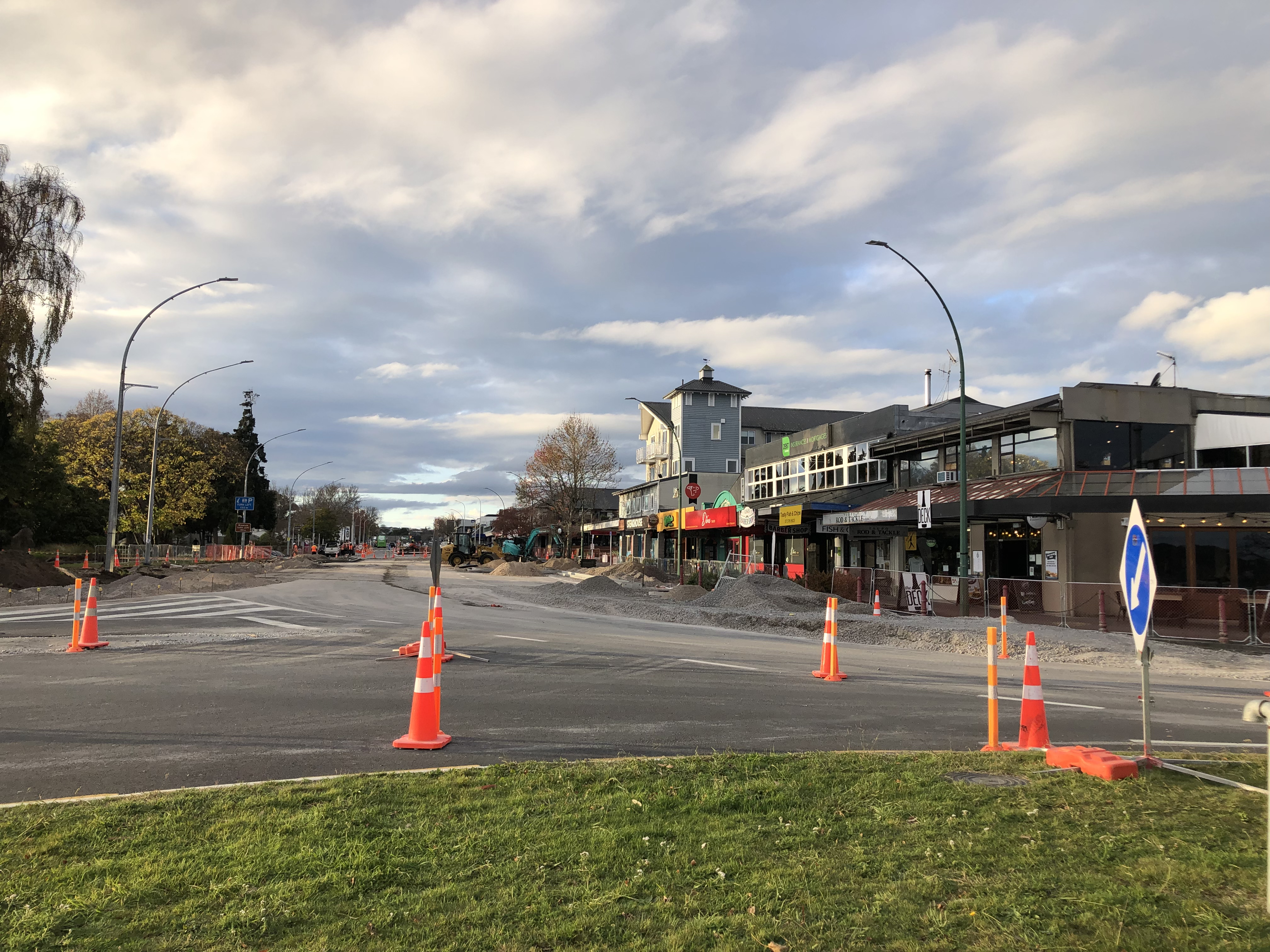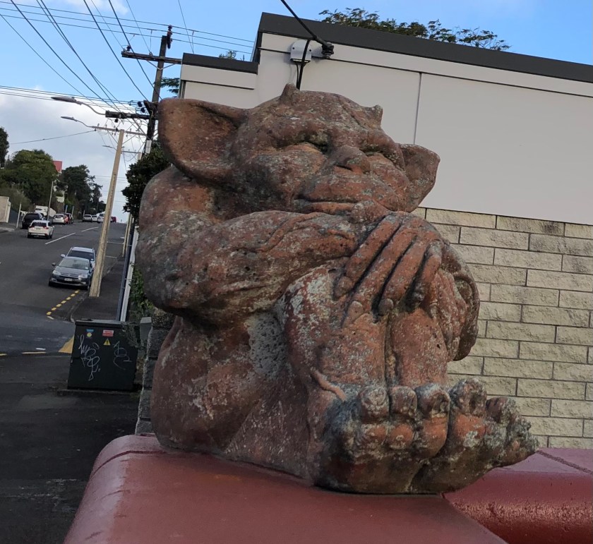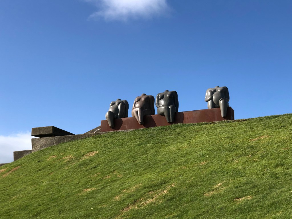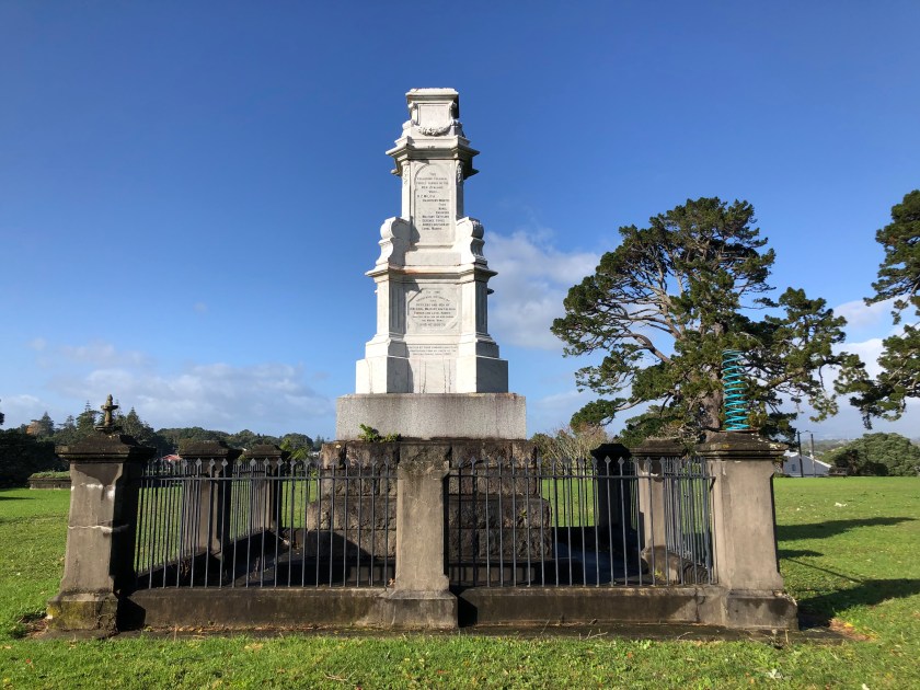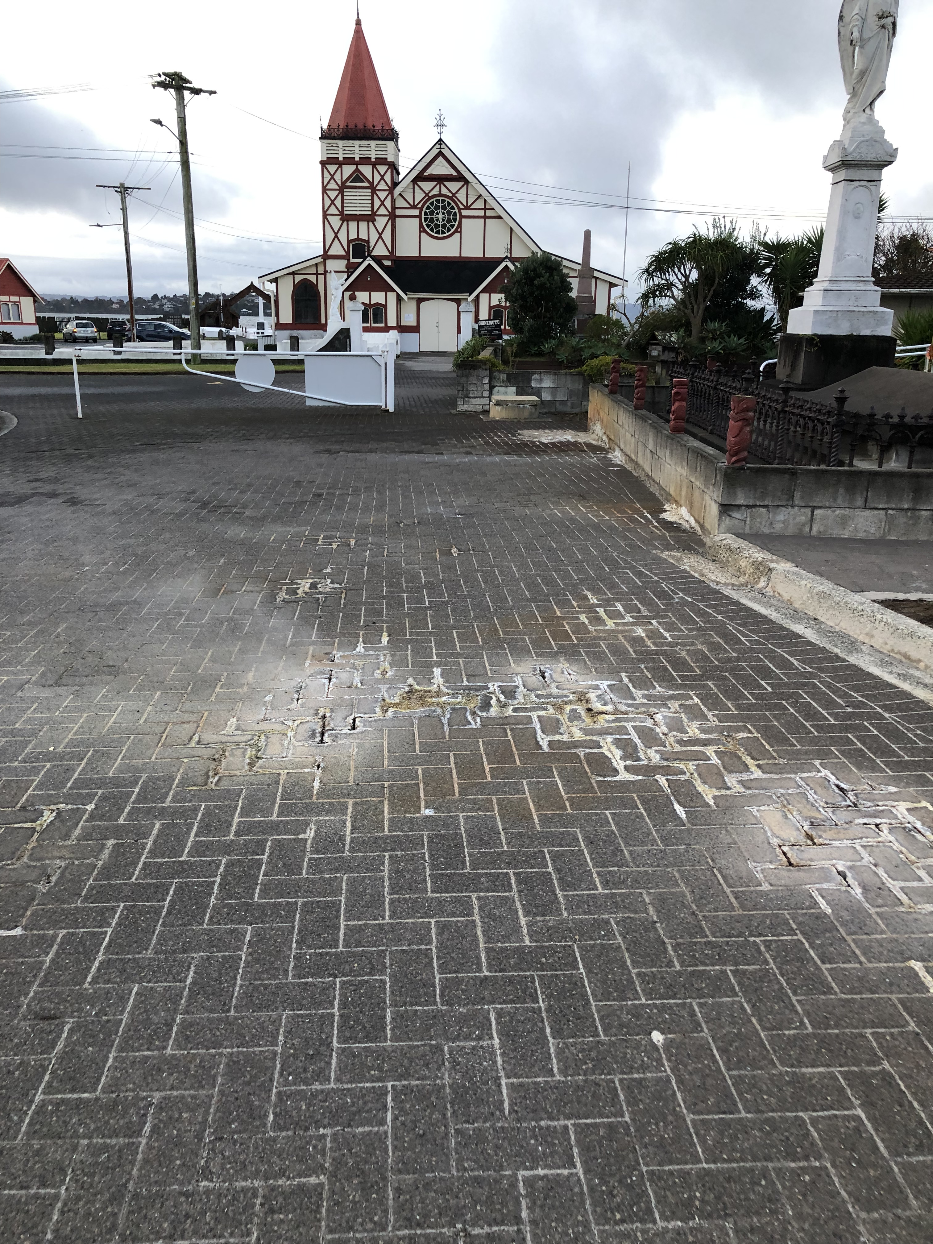 Es dämmerte schon (obwohl das bei dem Wetter schwer zu sagen war, weil es eh ziemlich dunkel war), als wir unser letztes Ziel für heute erreichten, das Ohinemutu Village. Hier gibt es eine Kirche, ein Marae (Maori meeting house), einen Friedhof und jede Menge Skulpturen, Dampf (sogar aus der Straße) und Schwefel zu sehen bzw. zu riechen: