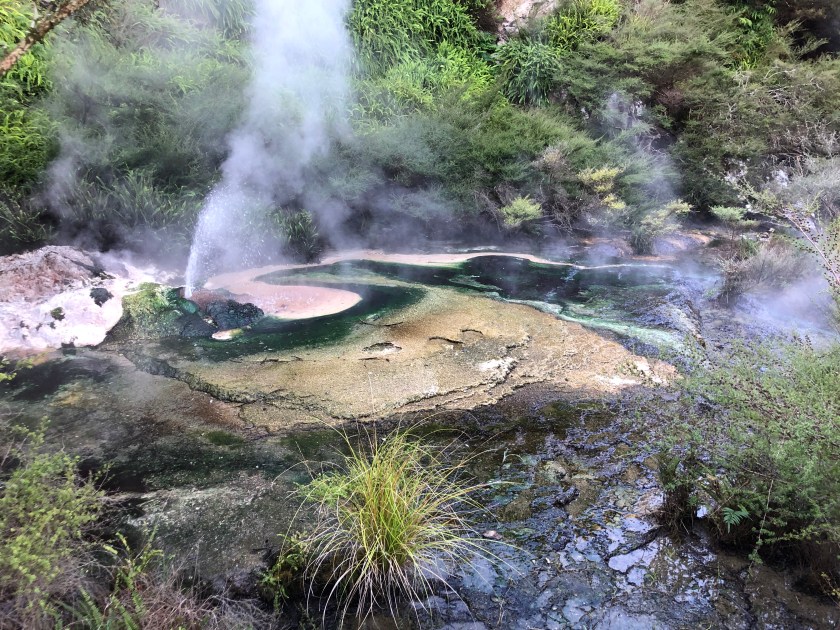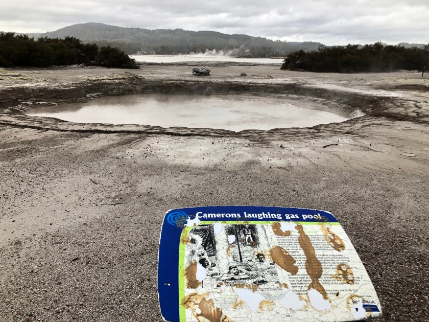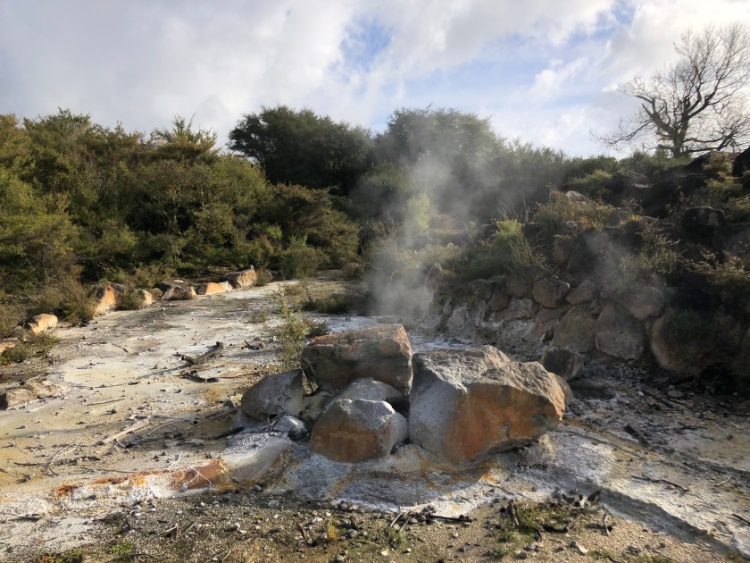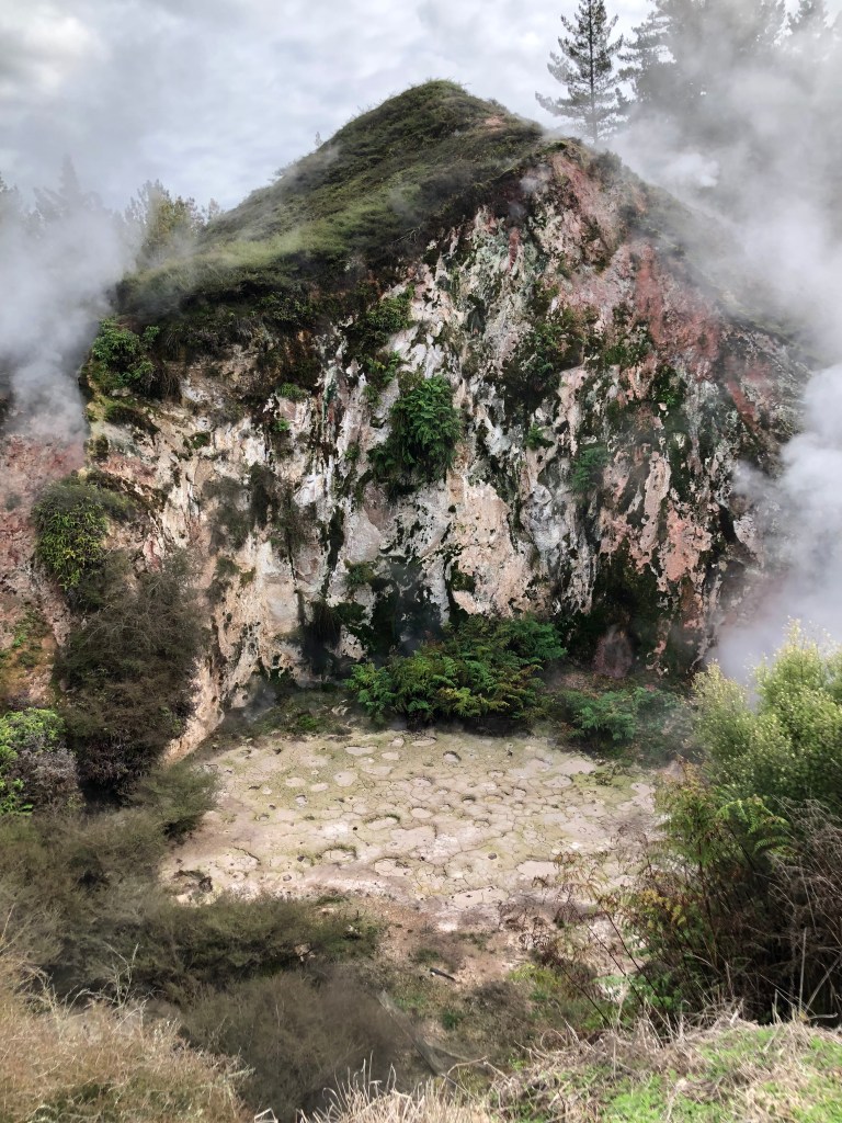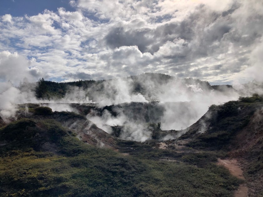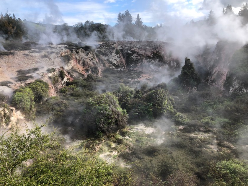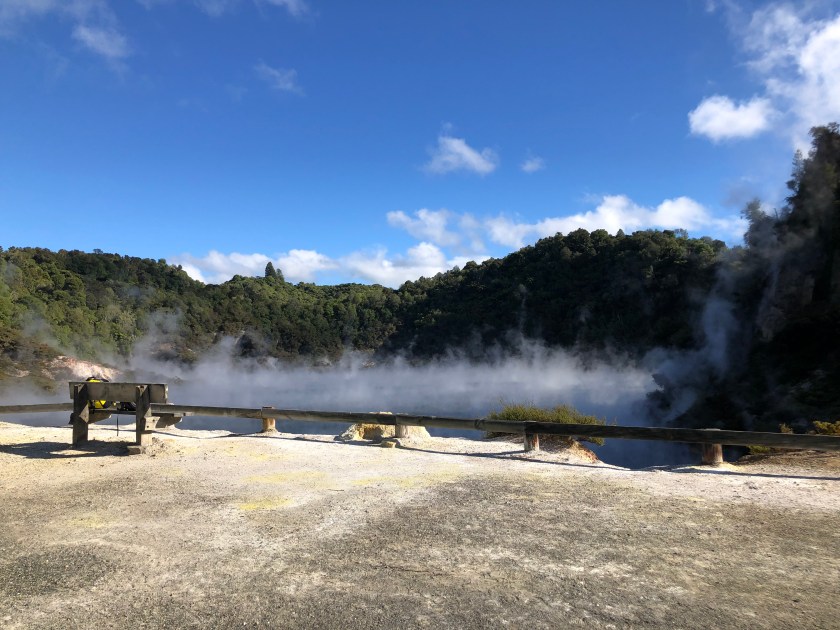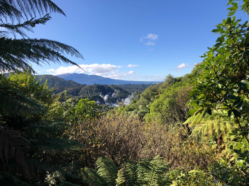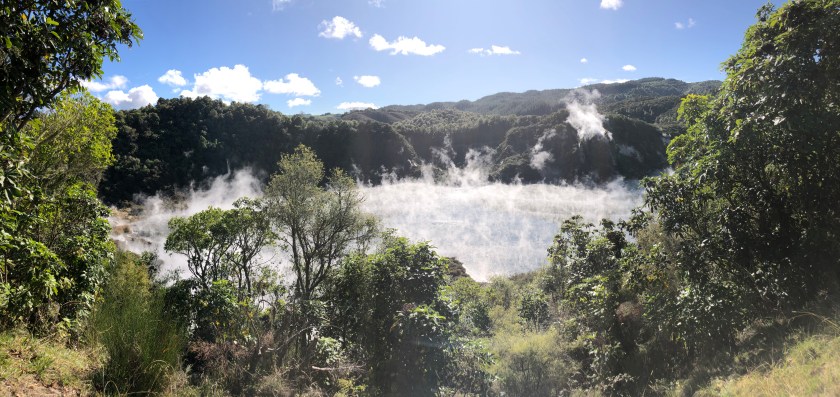 Zuerst gönnten wir uns einen Kaffee im Café im Visitor Center, bevor wir schließlich loszogen, um mehr über den Vulkanausbruch des Mount Tarawera und wie er die Gegend verändert hat zu lernen. Hierfür spaziert man einige Kilometer durch das ganze Tal bis hin zum Lake Rotomahana, vorbei an kochenden Seen, heißen Bächen, sprudelnden Quellen, verschiedenfarbigen Böden, Farnen usw usw – es war atemberaubend (nicht nur der kurze steile Hike hinauf zum Aussichtspunkt ;-)). Hier eine Kostprobe: