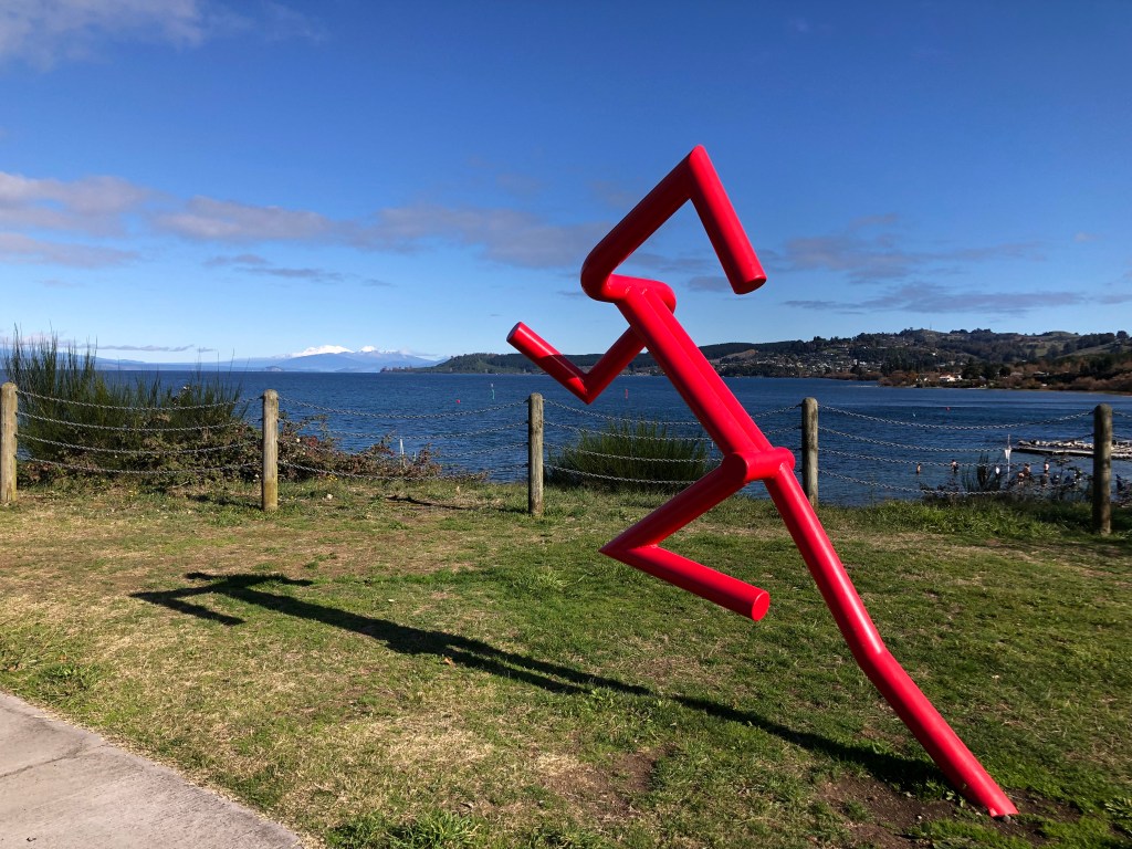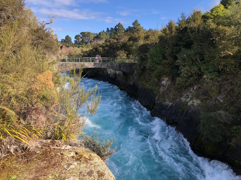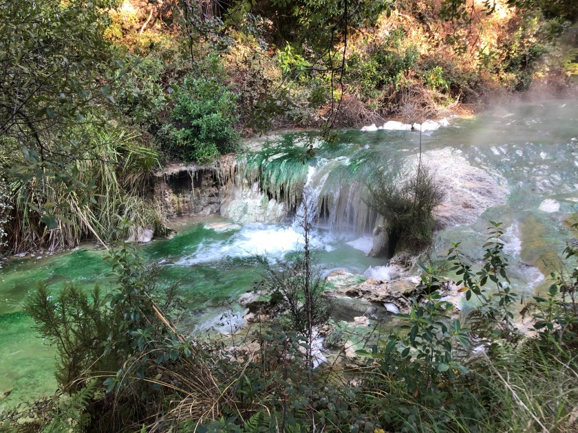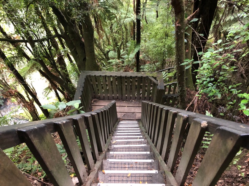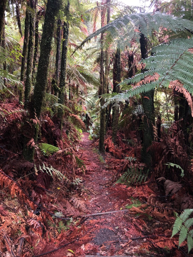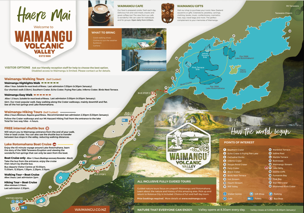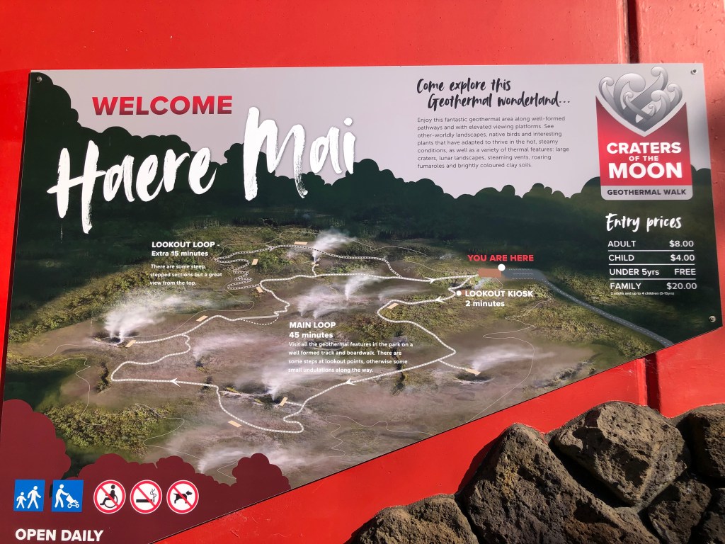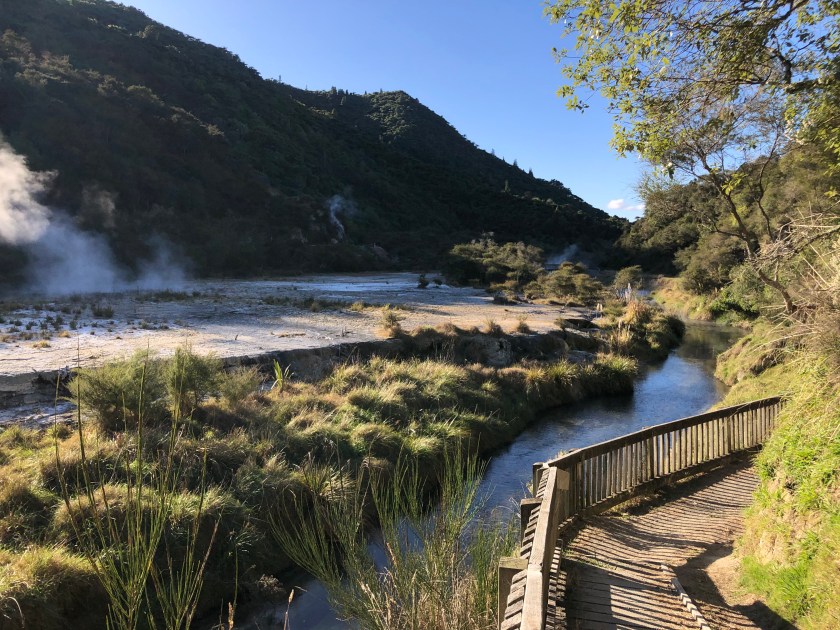 Zuerst gönnten wir uns einen Kaffee im Café im Visitor Center, bevor wir schließlich loszogen, um mehr über den Vulkanausbruch des Mount Tarawera und wie er die Gegend verändert hat zu lernen. Hierfür spaziert man einige Kilometer durch das ganze Tal bis hin zum Lake Rotomahana, vorbei an kochenden Seen, heißen Bächen, sprudelnden Quellen, verschiedenfarbigen Böden, Farnen usw usw – es war atemberaubend (nicht nur der kurze steile Hike hinauf zum Aussichtspunkt ;-)). Hier eine Kostprobe: